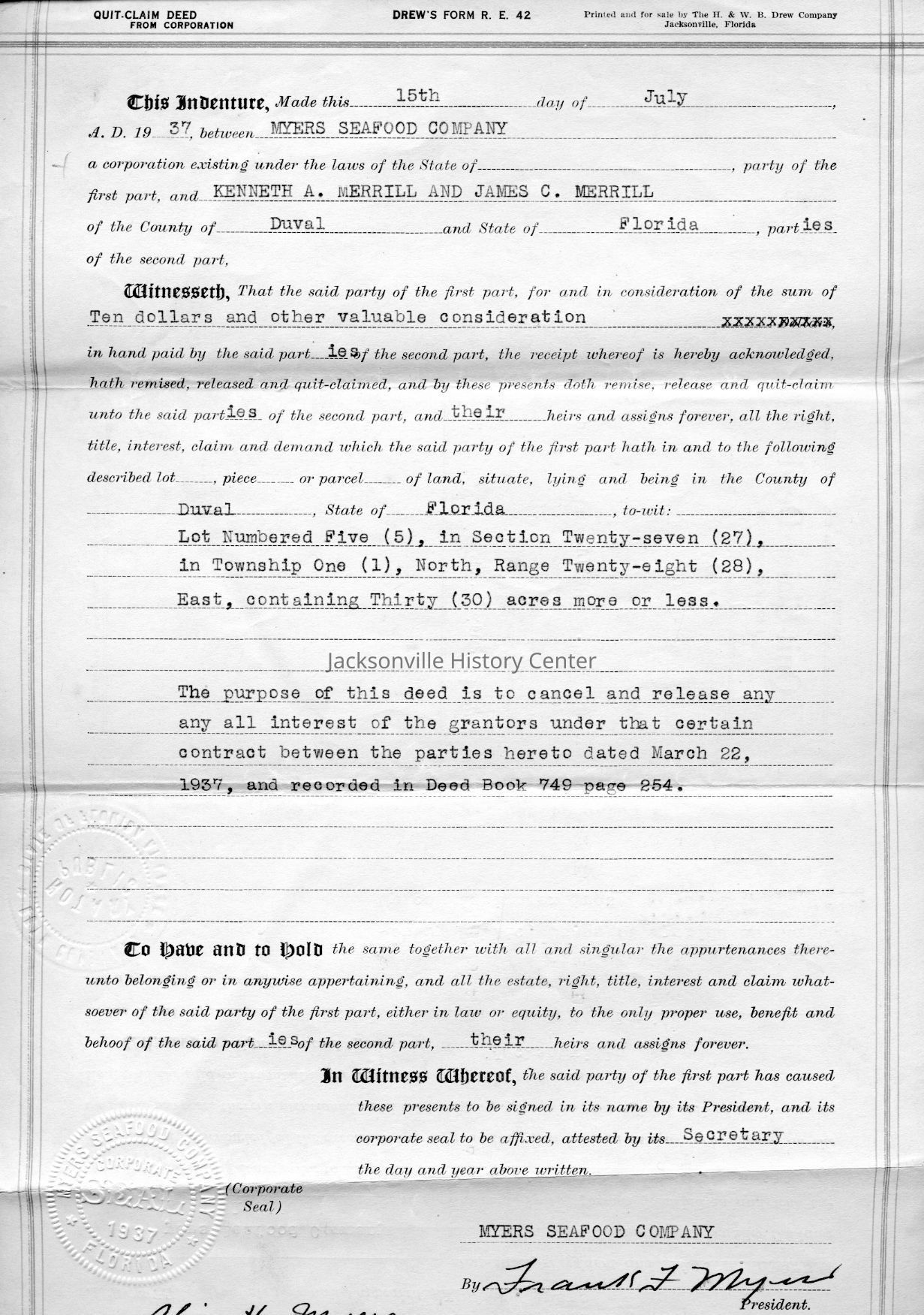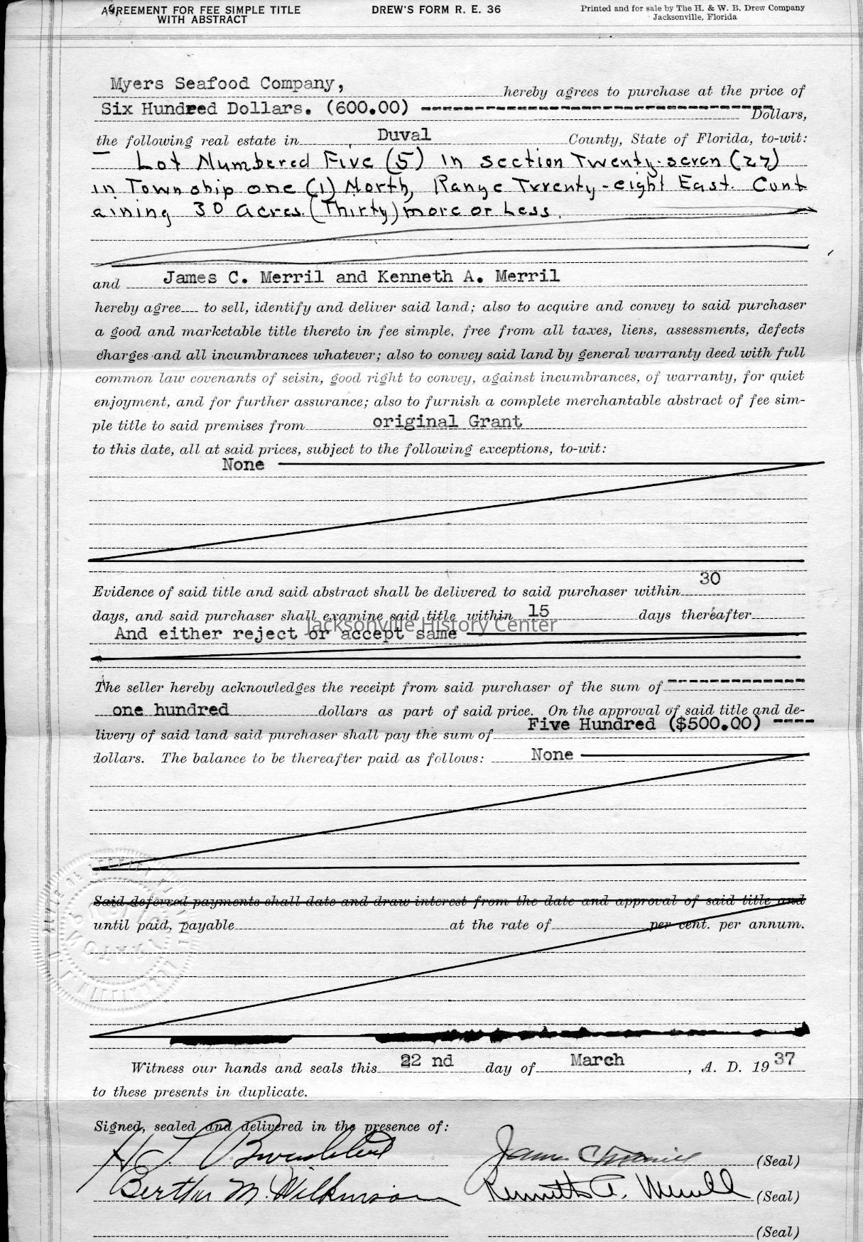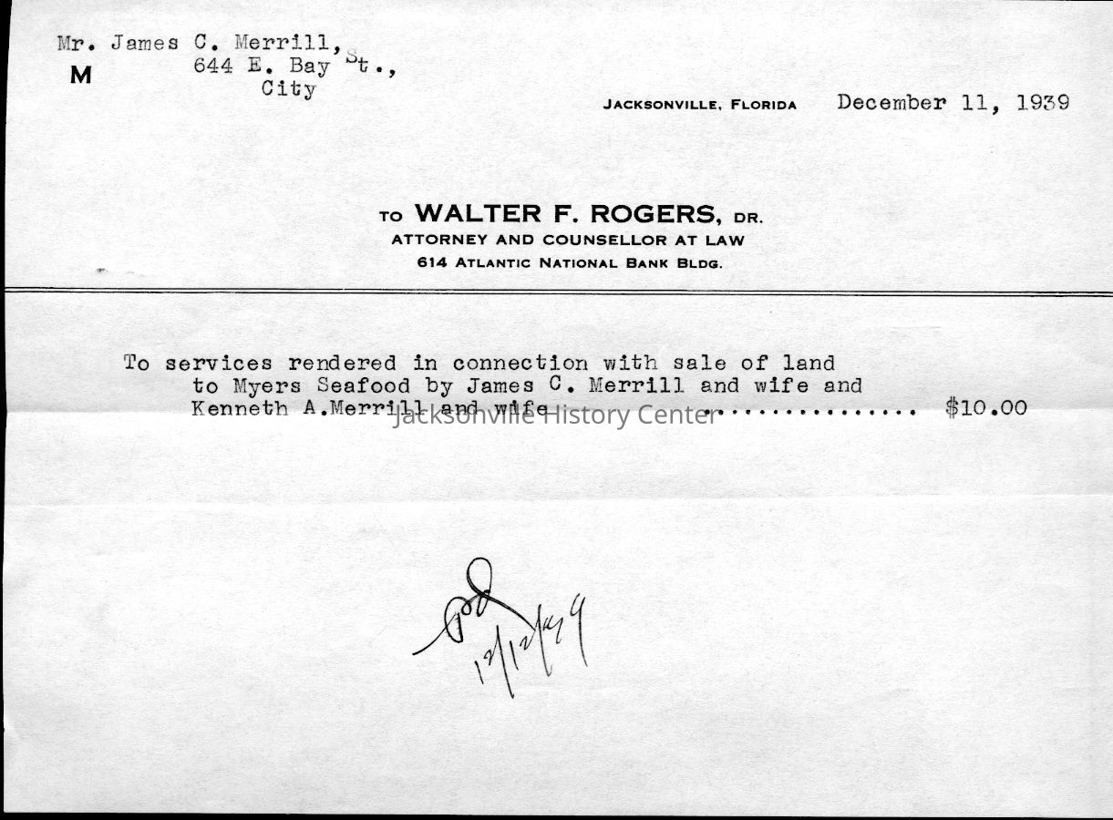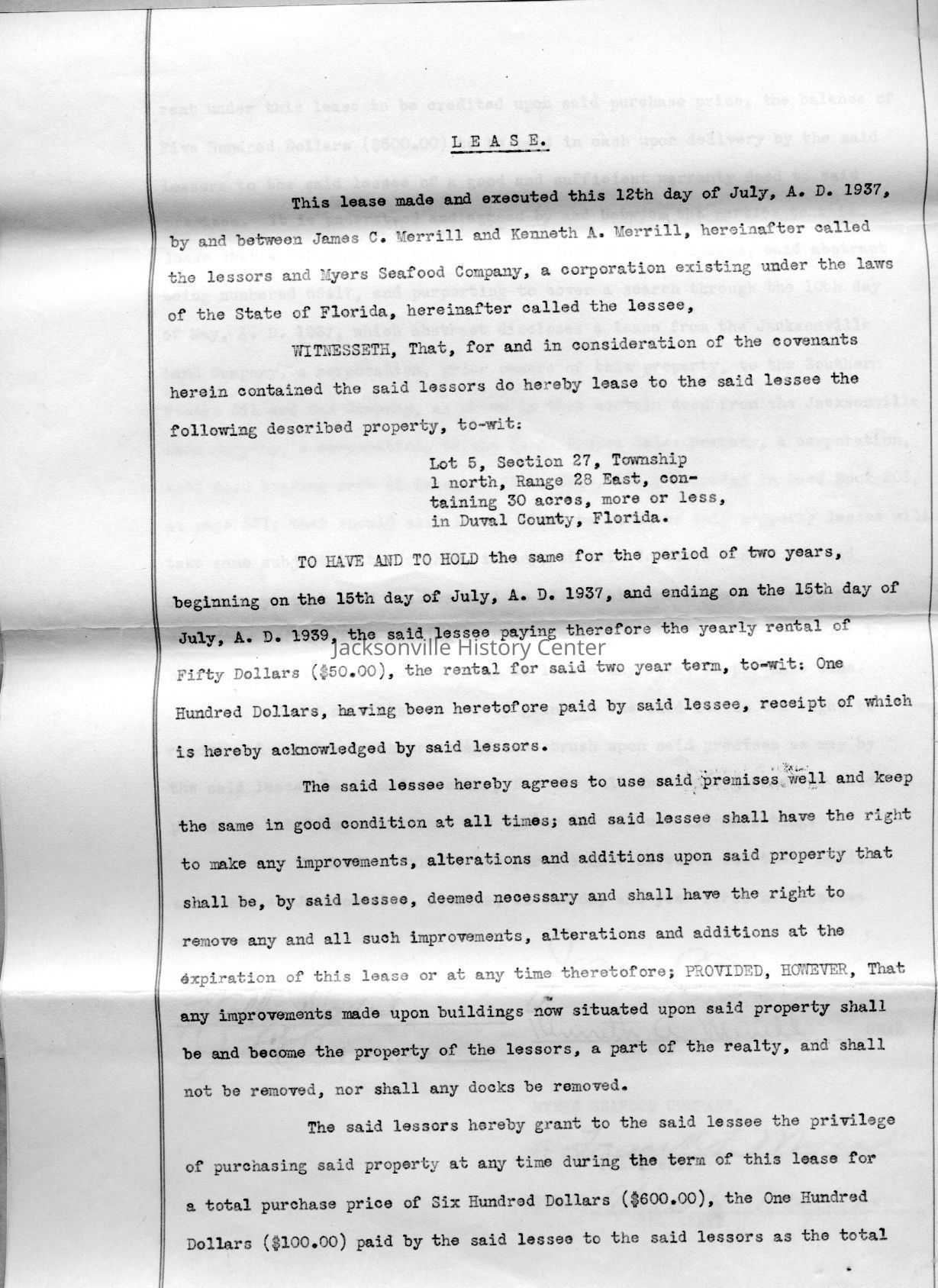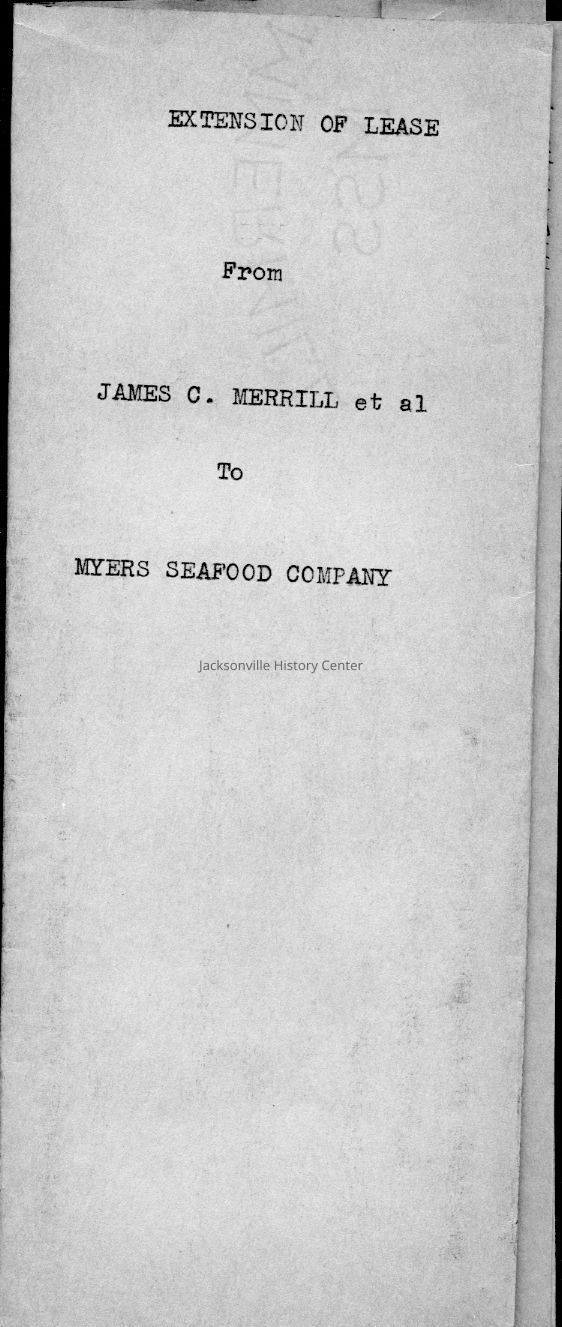 MC14.4.1-MC14.4.15—legal and financial papers—Deed of sale dated 3/22/1937, tax receipt 1937, tax receipt 1938, Extension of lease from James C. Merrill et al to Myers Seafood Co 05/20/1939, Lease dated 07/12/1937, quit-claim deed dated 07/15/1937, tax receipt 1939, correspondence 12/11/1939, receipt 12/11/1939, correspondence dated 12/12/1939, correspondence dated 12/28/1939, correspondence dated 01/08/1940, warranty deed dated 6/8/1937, correspondence dated 12/4/1939, correspondence dated 11/28/1939Date(s) of Creation