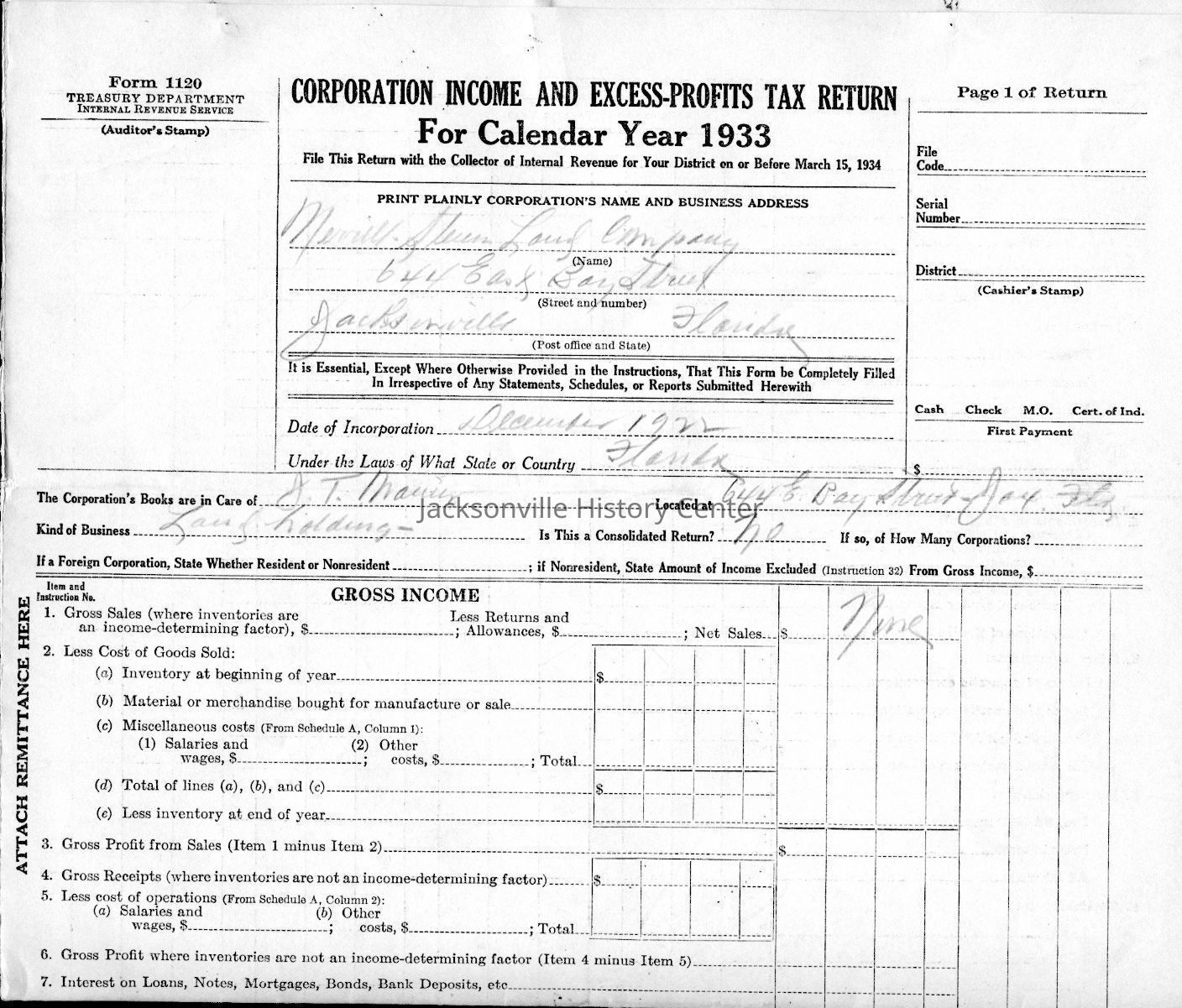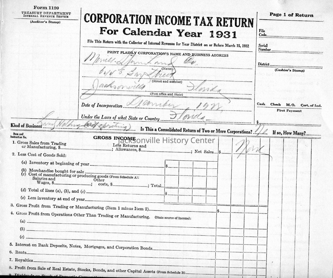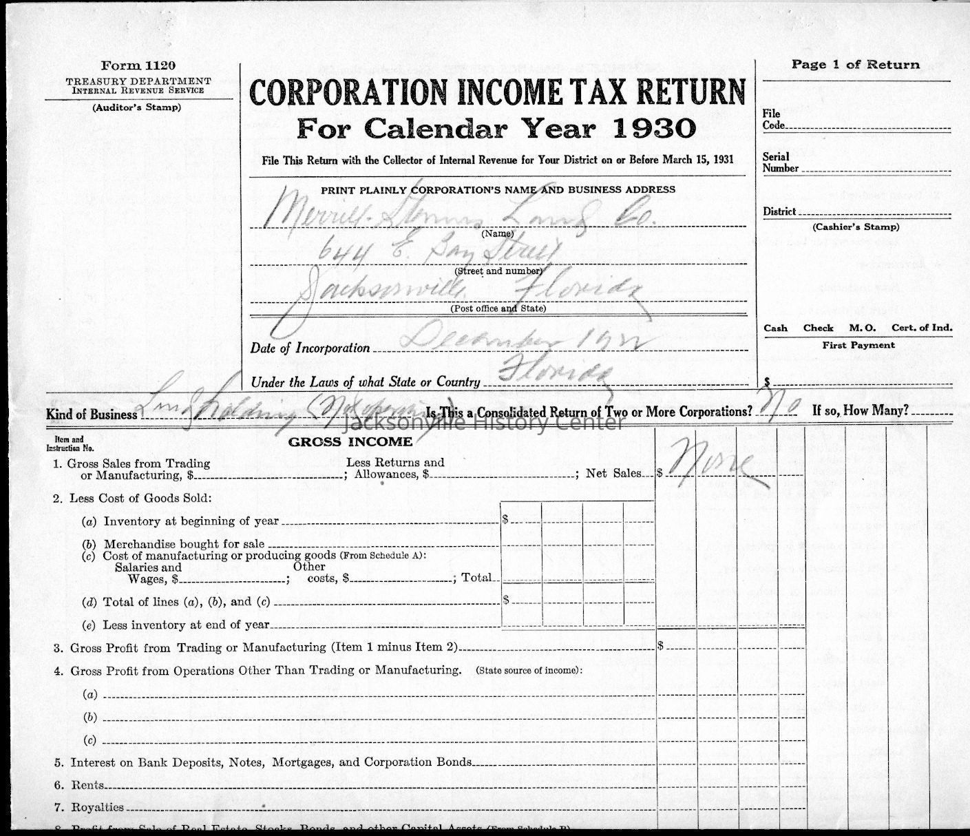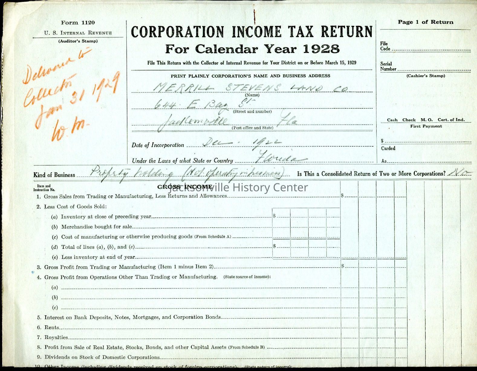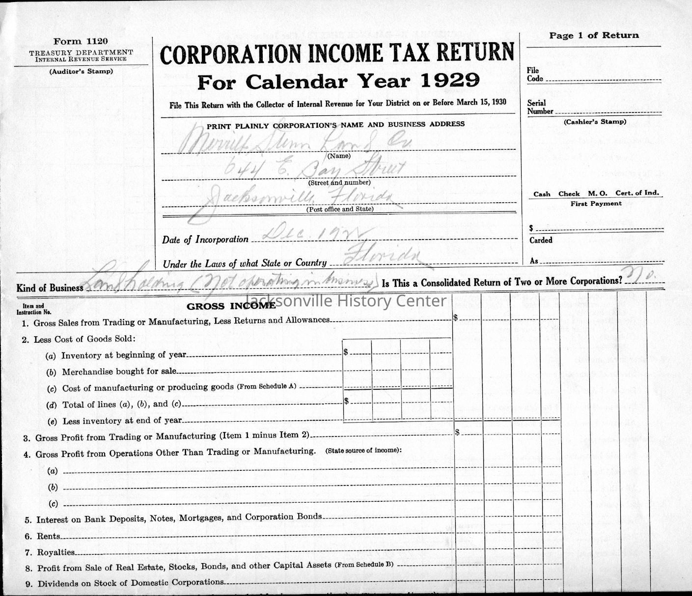 U. S. Internal Revenue Corporation Income Tax Returns 1928, 1929, 1930, 1931, 1932, 1933; Corporation Report and Tax Returns to the State of Florida 1933, 1936Collection