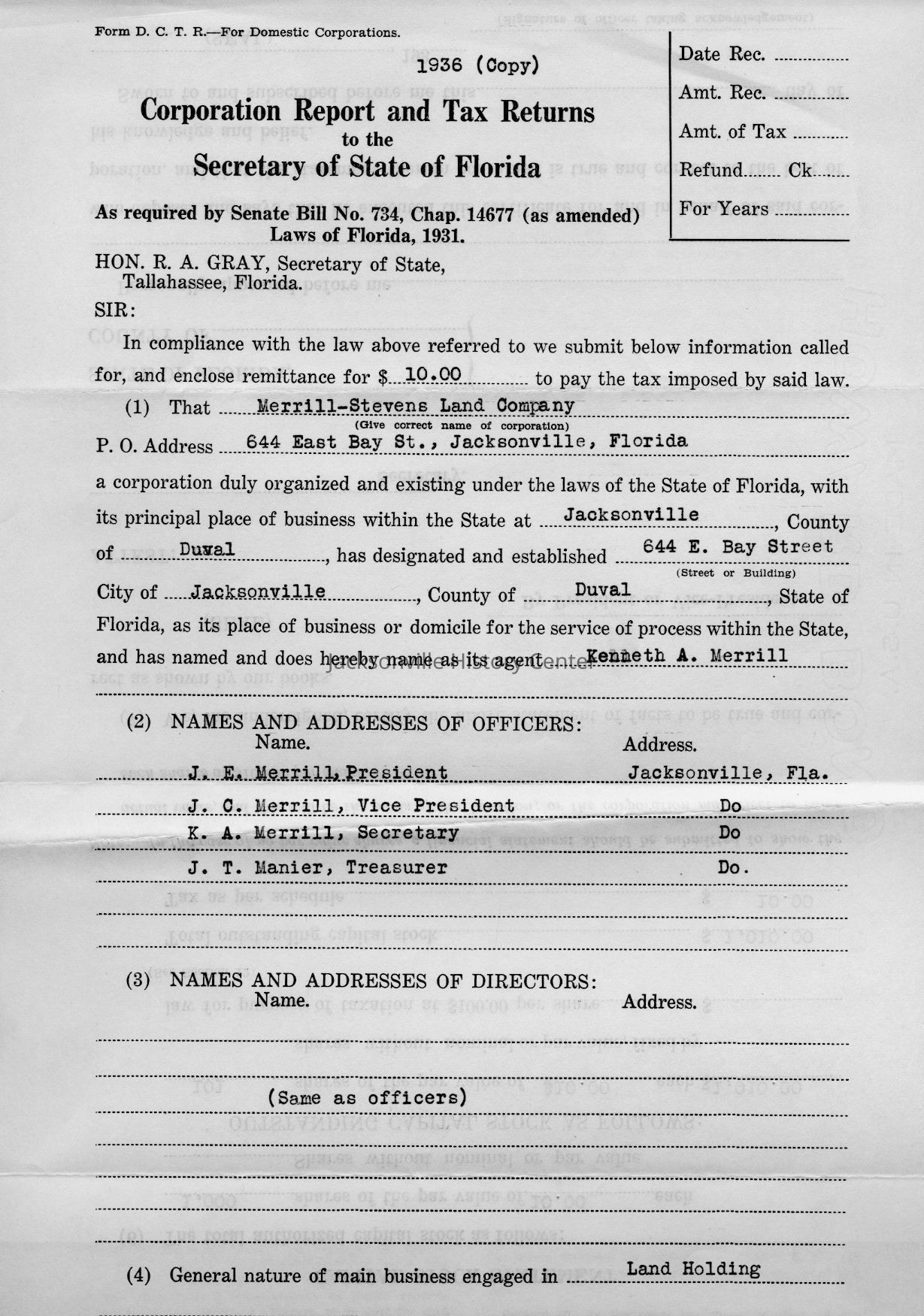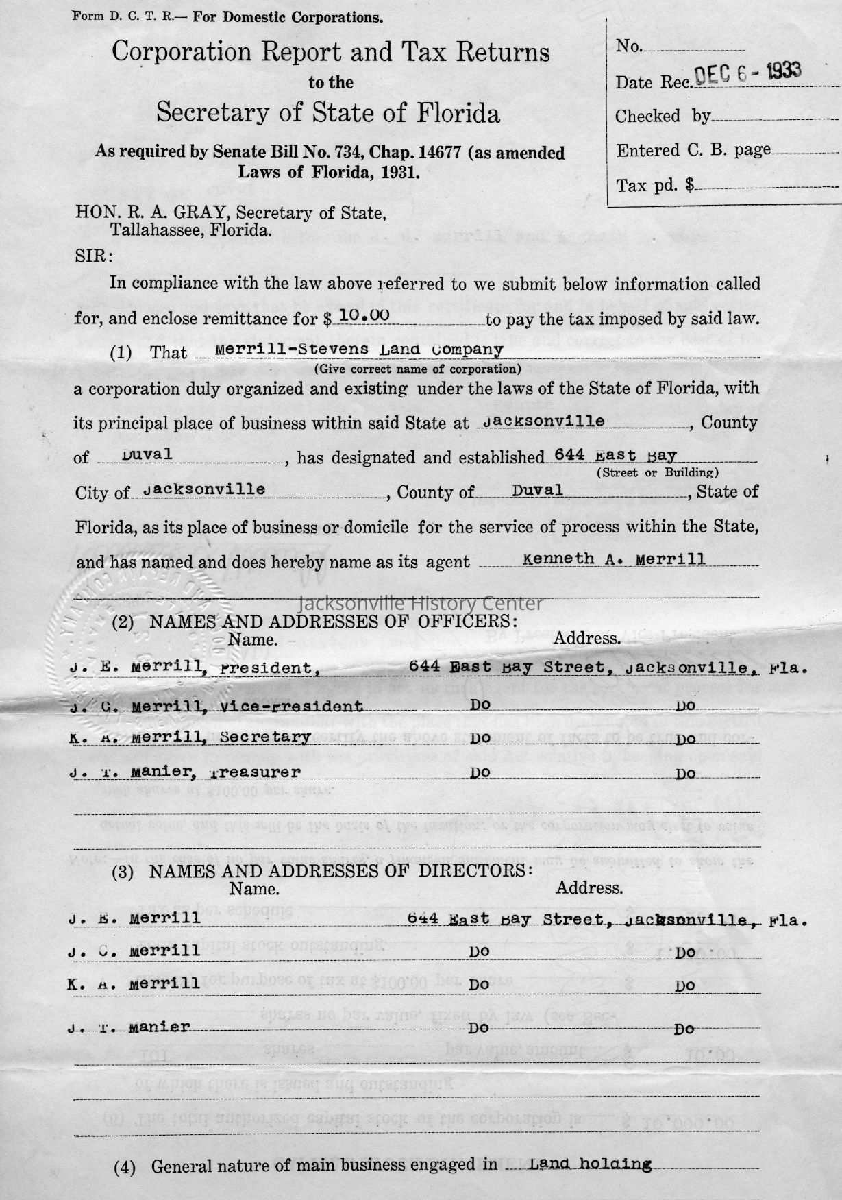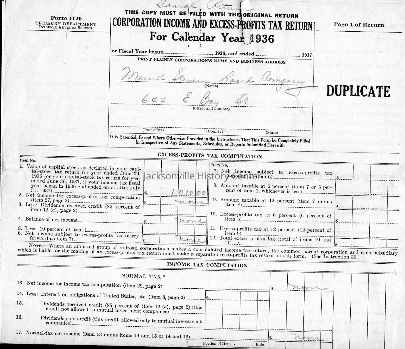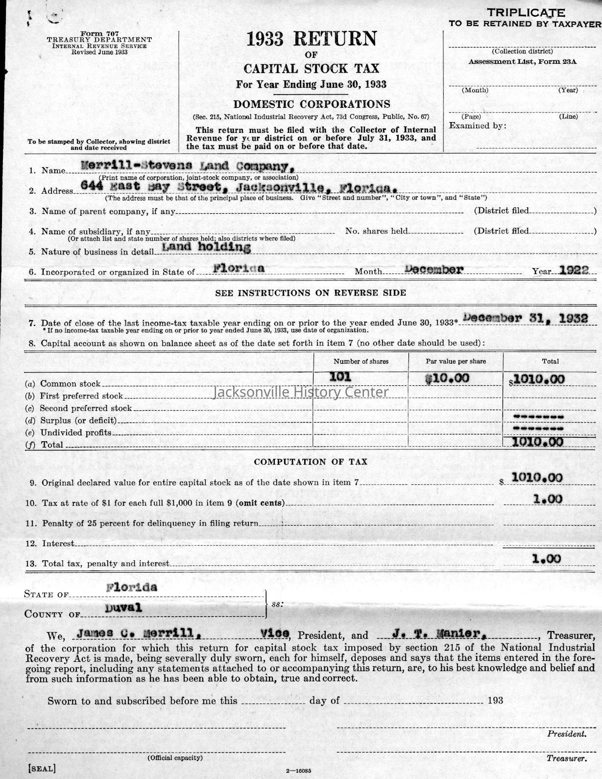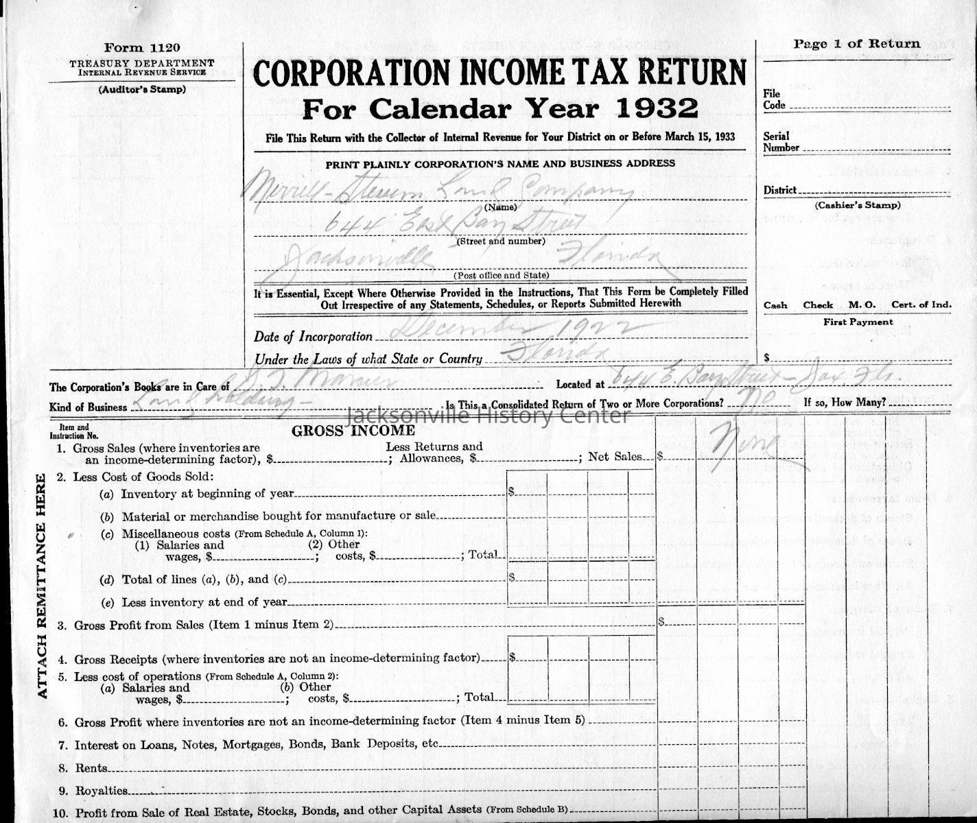 U. S. Internal Revenue Corporation Income Tax Returns 1928, 1929, 1930, 1931, 1932, 1933; Corporation Report and Tax Returns to the State of Florida 1933, 1936Collection
