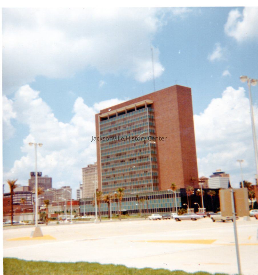 City Hall and parking lot on the St. Johns River in Jacksonville, Florida in June 1966.