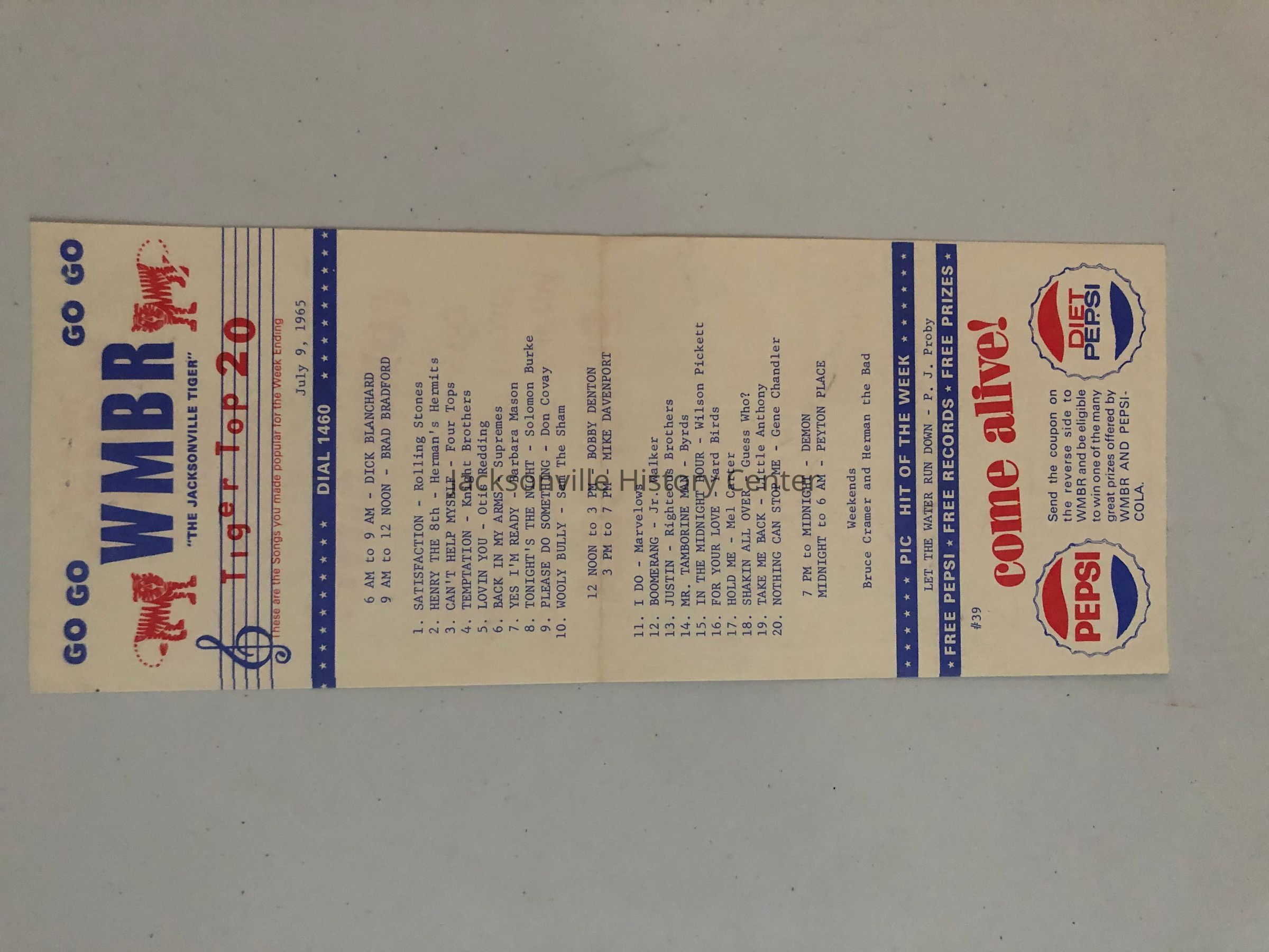 Song list: "Tiger Top 20," WMBR 1460-AM, "The Jacksonville Tiger" pop music radio station, Jacksonville, Florida, July 9, 1965.Collection