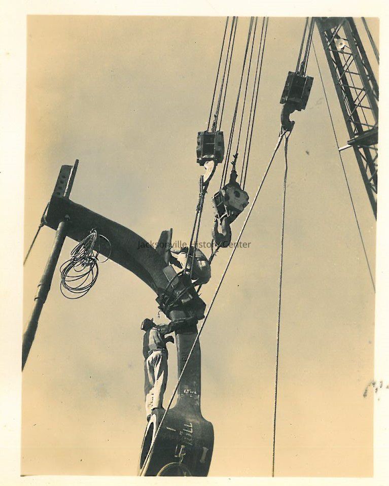 Workers setting large casting/forging at keel; rudder pivot and propeller shaft bearing