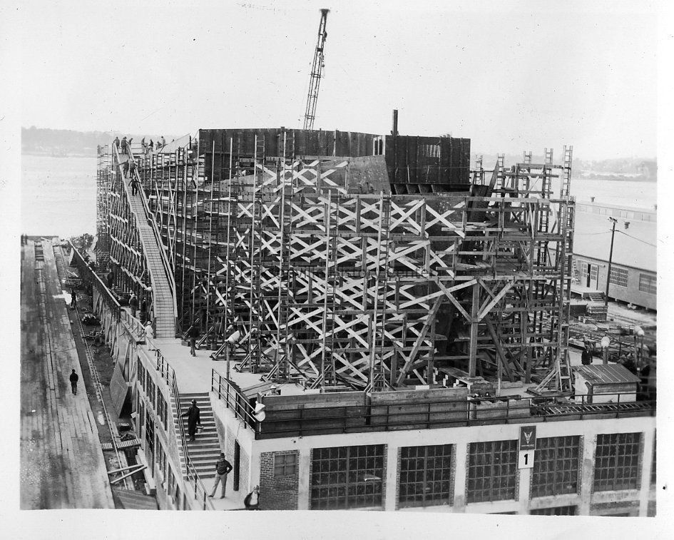 Keel at bow; bulkheads in background. Another ship underconstruction in background