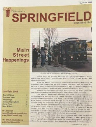 Selected contents Jan. 2004 (17th annual holiday festival tour of historic homes -- Main street is landscaped -- English lord and a German fraulein - Pembertons came to Jax in 1903, Dick worked at Southern Bell, lived in the 500 block of E. 5th Street, children christened at old St. Andrews Episcopal Church, Dick died in 1941) / Jean St. Jon Wirth -- July/August 2004 (Bob Swanson idea to have payroll deduction for SPAR -- Second annual auction a hit by Susan Noonan -- Black crowned night herons nesting in Springfield -- Ryan's update by Ryan Fix -- Springfield Garden Club holds 1st meeting as Springfield Garden Club on June 26, 2004, master garner India Kurtz spoke) -- Nov/Dec 2005: (Jewish Center building -- Board of Director elections -- Alleys of Springfield --Block captains --2005 Holiday Home tour -- Classic dolls by Katie Mahoney New businesses such as Springfield Cleaners, Abundance Hair -- Mommies group-- March 2006 (President Louise DeSpain -- Newsletter going monthly with this issue -- Thank you to Mack Bissette for restoring the Mary Dillon Fountain -- Rose arbor at Confederate Park) -- June 2006 ( Liberty Park springs back to life -- Garden club by Joe Molenda -- Springfield Animal care & rescue club by Cathy Campbell) --Sept. 2006 -- (Spark park activity including softball game, animal care & rescue club, youth sports -- Crime drops 17 % -- Council elections -- Be a Springfield doer & donor) -- October 2006 ( Three ways to show pride -- Walter Kingston owner of Vanderleigh Furniture & Antiques -- Heritage pageant -- Dog park -- Woman's Club holiday tour , Mommies group -- Tree inventory) Nov. 2006 ( Mary Dillon Fountain in Klutho Park celebration- SPAR Council elects new officers -- By the numbers on value of real estate in area -- Security a city benchmark -- Santa Paws comes to town) -- July 2007 ( Matchup between Eastside Reds and Westside Giants baseball -- Community block captains curtail dumping -- First annual Springfield relay for life -- Annual national night out -- Hogans Creek greenway plans -- Bank of America -- Hola! Mexican Restaurant) -- January 2008 (Hosted the Urban safari tour where 25 JCCI members were informed about progress and history of Springfield -- 315 E. 7th Street house for sale -- New businesses include Antique Mall, Baker Klein Engineering, Property Management for Springfield) -- March/April 2008 (Cafe 331 worth a taste -- Chili cookoff -- Springfield 5K -- Crew tackles Hogan's Creek -- Paco location shopping handy) -- Nov/Dec 2008 ( Local inn-Dixie -- Holiday bazaar --A to Z sandwiches is a long standing tradition -- Jan/Feb 2009 (Two new businesses open : BP station, Premier Pharmacy -- Girl Scouts cookie sales -- Hola Mexican Restaurant ) -- March/April 2009 (Two new businesses, A-Z Gonstead Chiropractic Clinic & Sargent Cycle open -- Color photo of Carl's Main St Restaurant) -- May/June 2009 ( 31st annual home & garden tour -- Drawing of Three Layers, a coffee house, 1602 Walnut St) -- July/August 2009 (New vision for Springfield, Third & Main building about to be completed -- Woman's Club -- Whet your whistle at the Cellar at Three Layers / Sharon Fye -- Color photo of Troy's house at 124 E. 4th St.) -- Sept/Oct. 2009 (Springfield bazaar -- Greek cuisine galore at Mike & Wafaa's).Collection