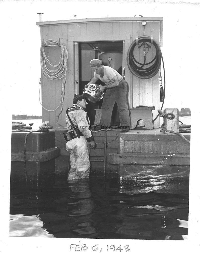 Diver being helmuted prior to dive.