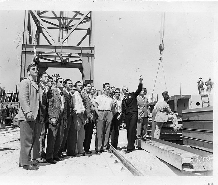 Group of men watching construction, guide pointing upwards.