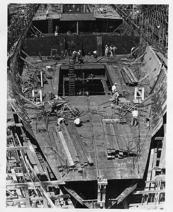 View from crane of hull with bulkheads in place and lower decks being constructed