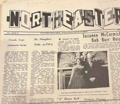 Northeaster (Nov. 1959) Volume 21, no.2. Northeaster is a student newspaper published by the journalism class of Fletcher High School that covers grades 7-12. It was located in Jacksonville Beach until it split into 2 schools in 1964. Selected names/activities: Nov. 1959 (Suzanne McCormick & Bob Burr reign, Nancy Daniels, Barbara Brown, Betty Holloway, John Rawls, Dr. Frank G. Slaughter spoke at JU, Bettina Burr, Ginger Strobeck, Carol Gorman, Linda Diz, Cathy Wentworth, Nevin Miller, Ginger Strobeck, Valisale brothers, Daneri Freeman, Ricky Diz, Senators football, basketball team overcomes Ribault, Cross country team, Beach Bowl sends a bus to pick up gym students for bowling)