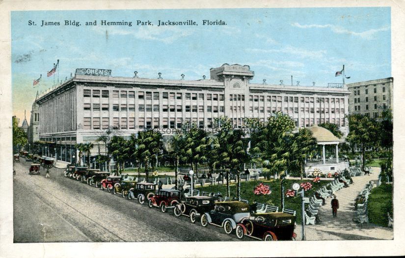 Hemming Park, in a down town section bounded by Laura, Monroe, Hogan and Duval Streets, is literal outdoor headquarters for Jacksonville's many tourists and other visitors. During the winter season daily band concerts are given here. the park is particuraly interesting because of unusual floral growth, palms, roses and other interesting plants. Ths St. James Building facing the park is shown in background.