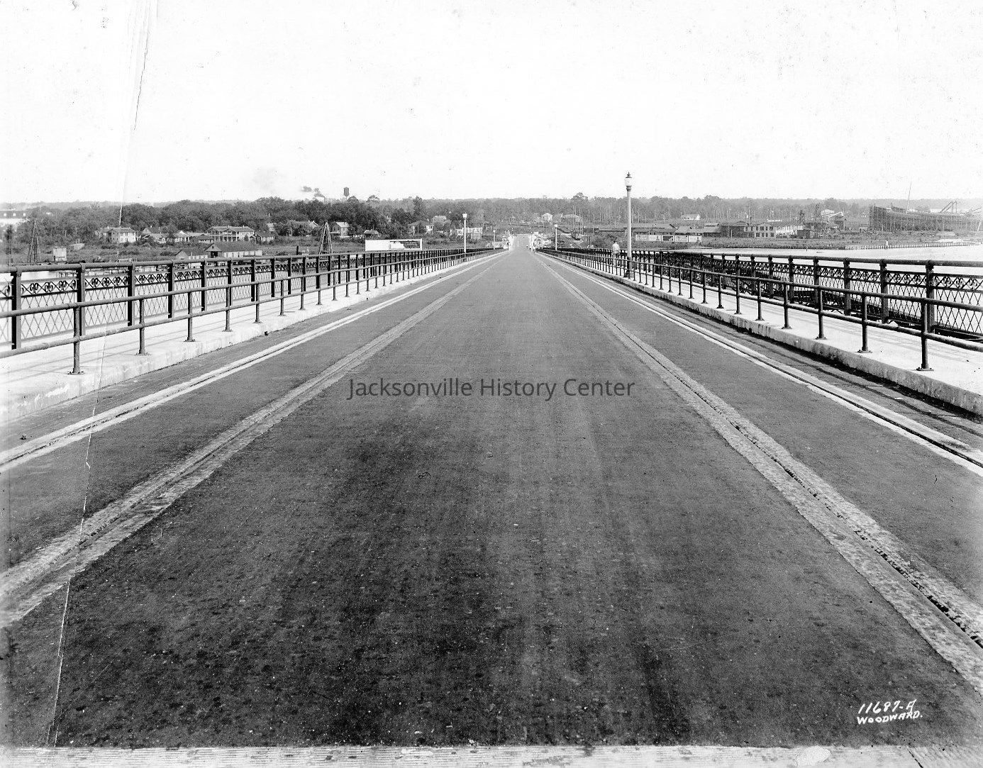 Acosta Bridge ramp towards Riverside. The Acosta Bridge included double tracks even though there was no car line on the south side of the river when it opened. The bridge intersected the Bridge Street Viaduct (what would later become the Riverside Viaduct on the Jacksonville side of the river, the newer viaduct over the railroad yards having replaced an earlier wooden one in 1905).
