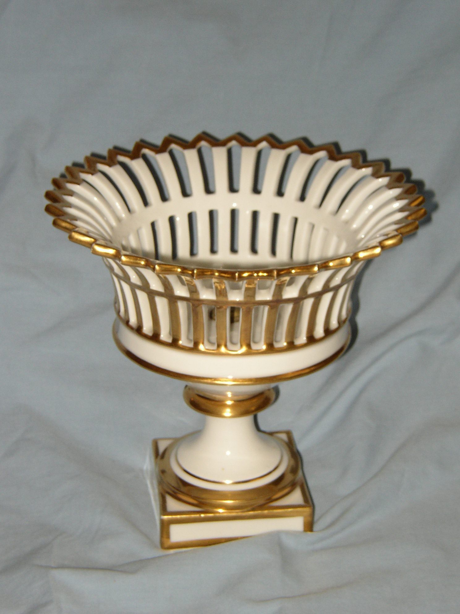 This compote is among the presidential china group, 2001.025.001-.017. This compote was used by the Monroes during the Monroe presidency. The bowl is trimmed with gold and includes a cursive gold "M" in a shield at top. The center of the compote is decorated with an eagle and shield surrounded by stars. The set was likely made in France around 1817.Collection