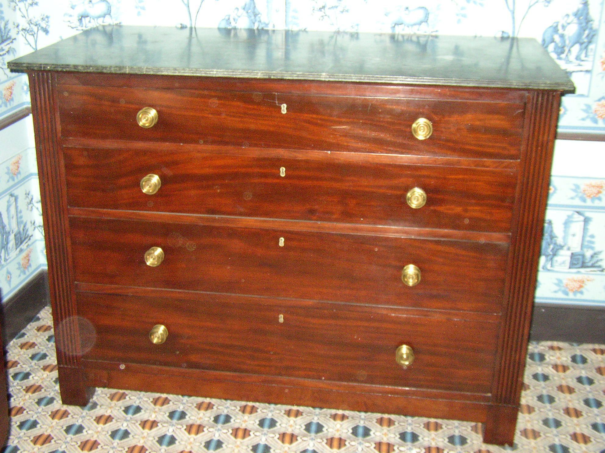 This is a mahogany commode with a green marble top. It has four drawers with stamped brass knobs. (Seven knobs are original; one is a replacement.) This commode was made by Washington, DC, by a cabinetmaker for the James Monroe White House circa 1818. The commode was signed by the cabinetmaker on the dust board, where there is also an address and Masonic symbols. This commode descended in the Monroe family through the Gouverneur-Hoes line of Washington, DC.Collection