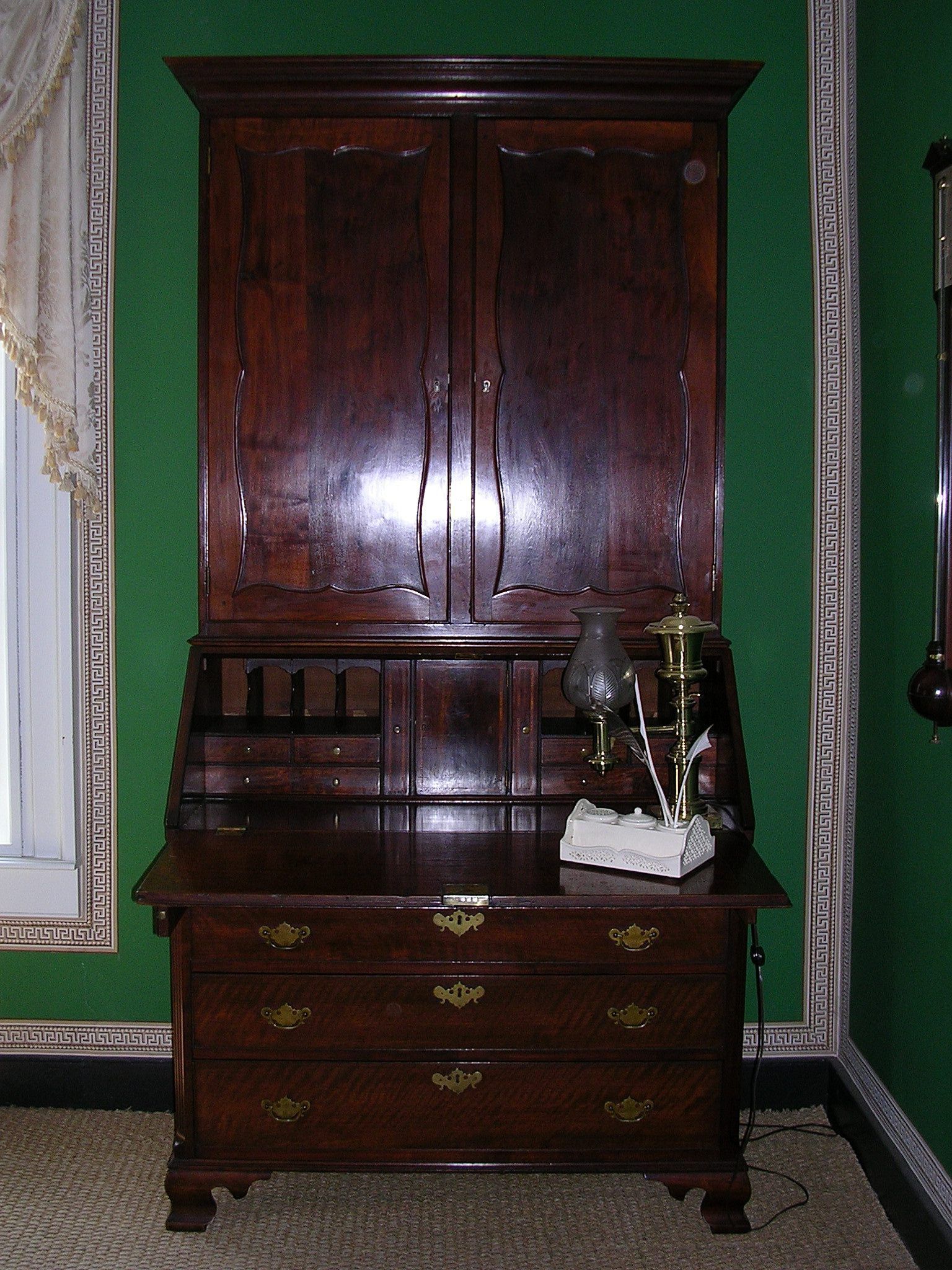 This is a walnut four-drawer, slant-top, two-piece secretary desk with two-door, four-shelf bookcase on top. This desk has a family tradition of ownership by James Monroe.