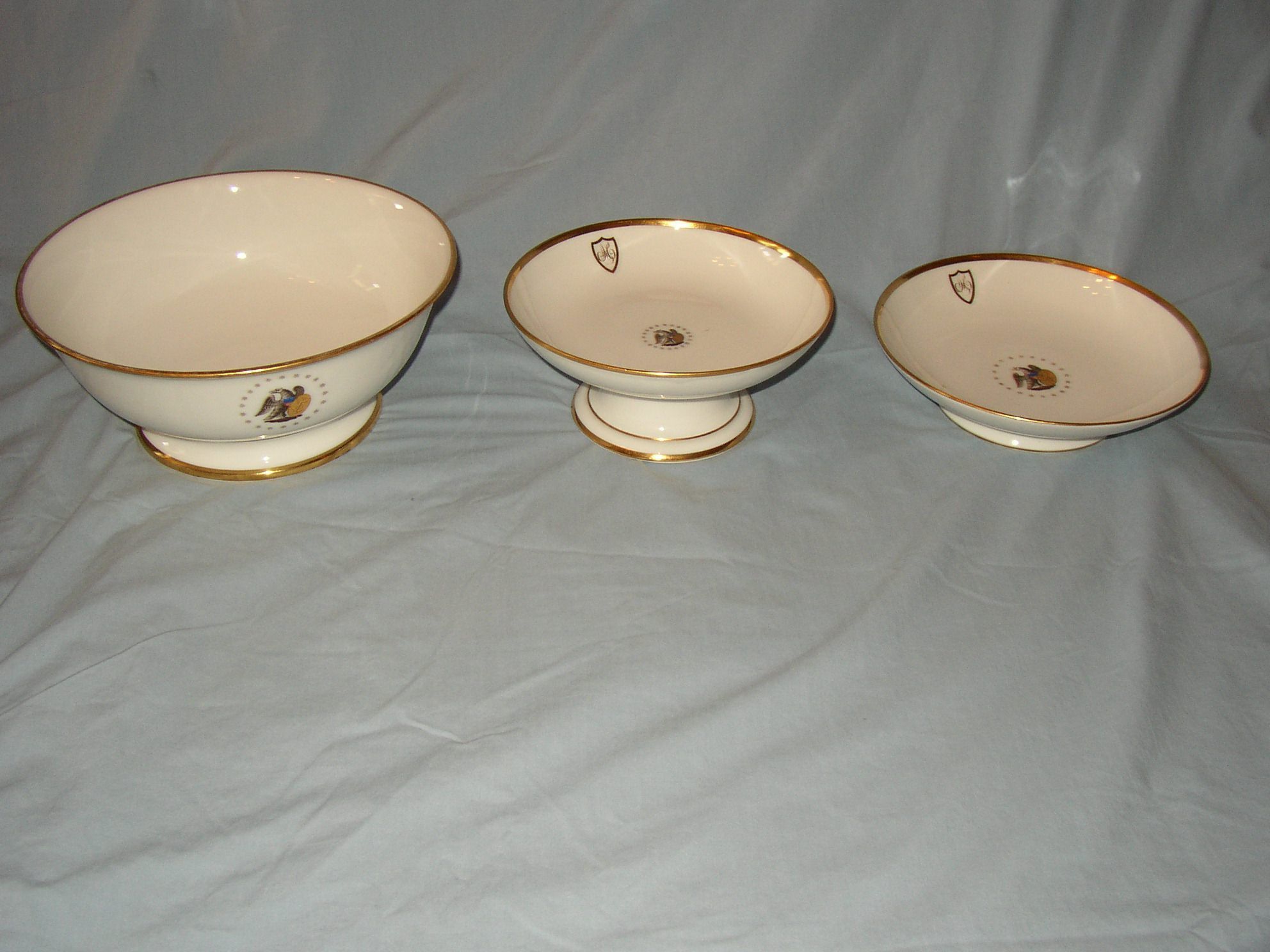 This bowl is among the presidential china group, 2001.025.001-.017. The white porcelain bowl was used by the Monroes during the Monroe presidency. The bowl is trimmed with gold and includes a cursive gold "M" in a shield at top. The center of the bowl is decorated with an eagle and shield surrounded by stars. The set was likely made in France around 1817.Collection