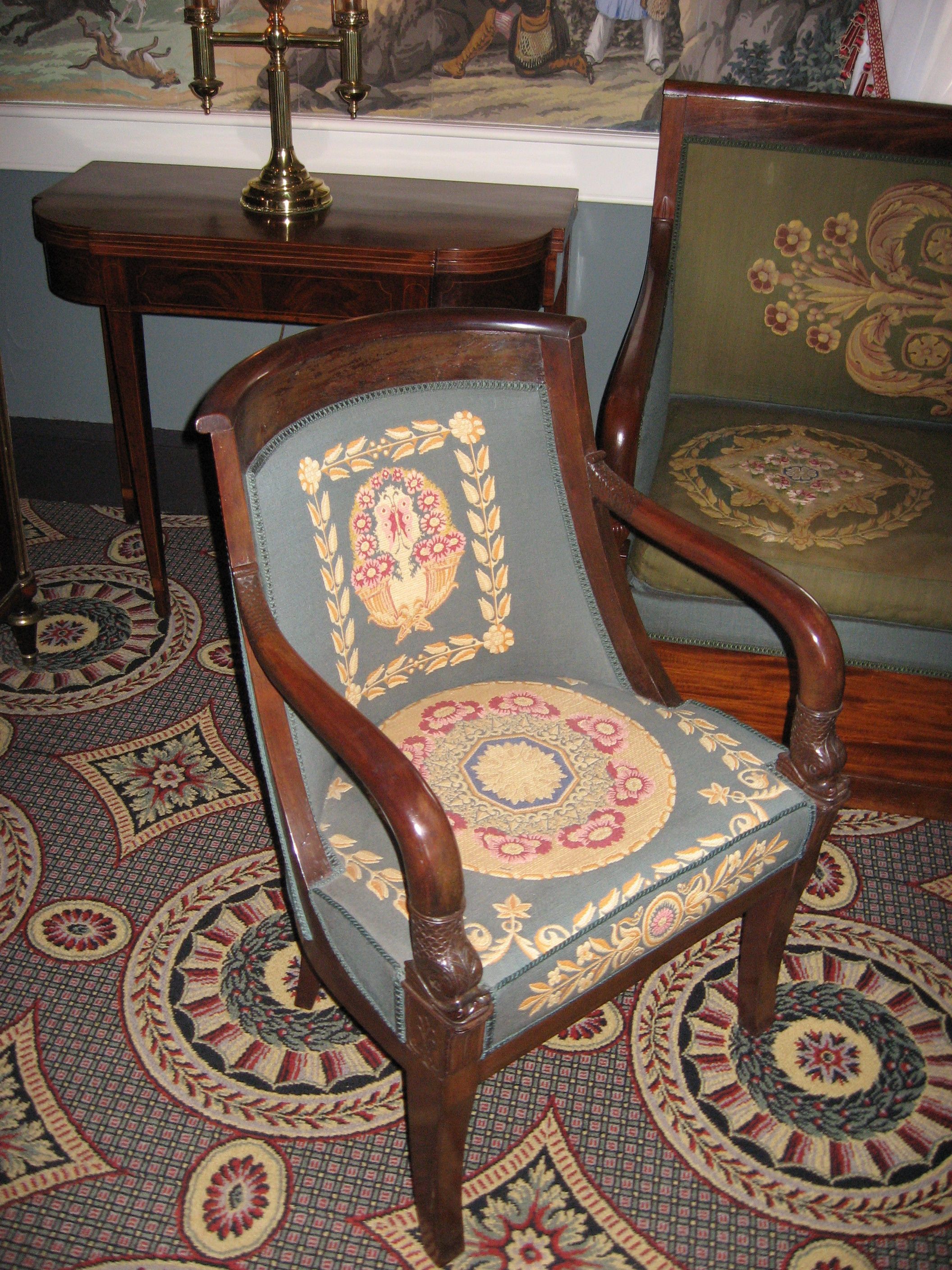This is an arm chair, part of set 1974.001.013-015, that features arms designed as stylized dolphins. It was made of mahogany and beech veneer in France. The chair is upholstered with its original blue upholstery. The upholstery webbing is attached to the chair using forged nails. The upholstery featured a stylized bouquet of red flowers surrounded by a stylized gold floral design.Collection