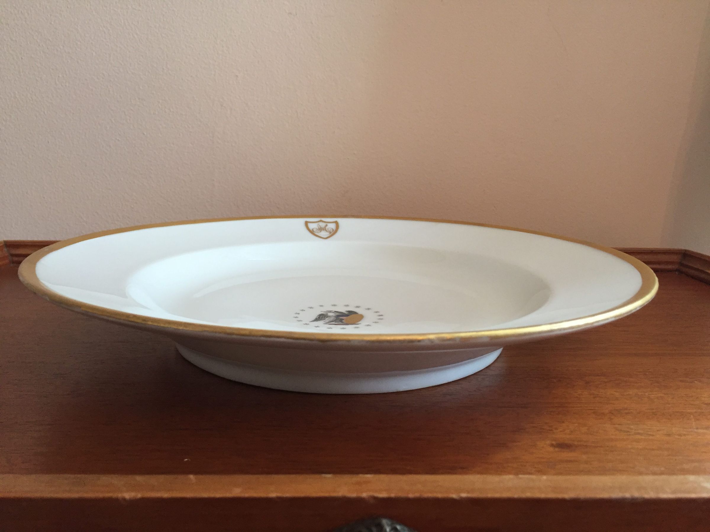 This charger is among the presidential china group, 2001.025.001-.017. The white porcelain charger was used by the Monroes during the Monroe presidency. The charger is trimmed with gold and includes a cursive gold "M" in a shield at top. The center of the charger is decorated with an eagle and shield surrounded by stars. The set was likely made in France around 1817.Collection