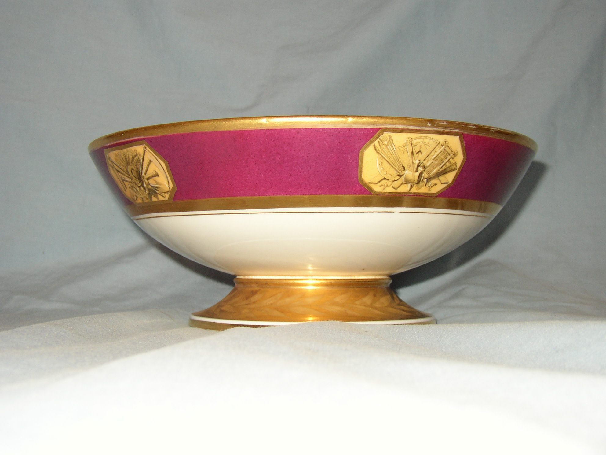 This is a white porcelain compote made by Dagoty-Honore in Paris, France, in 1817. The plate, part of set 2001.007.001-.003, is decorated with a red or cranberry-colored band around the outsiderim, accented by border vignettes that represent strength, the arts, commerce, the sciences and agriculture. This compote was made for the Monroes while Monroe was President of the United States.