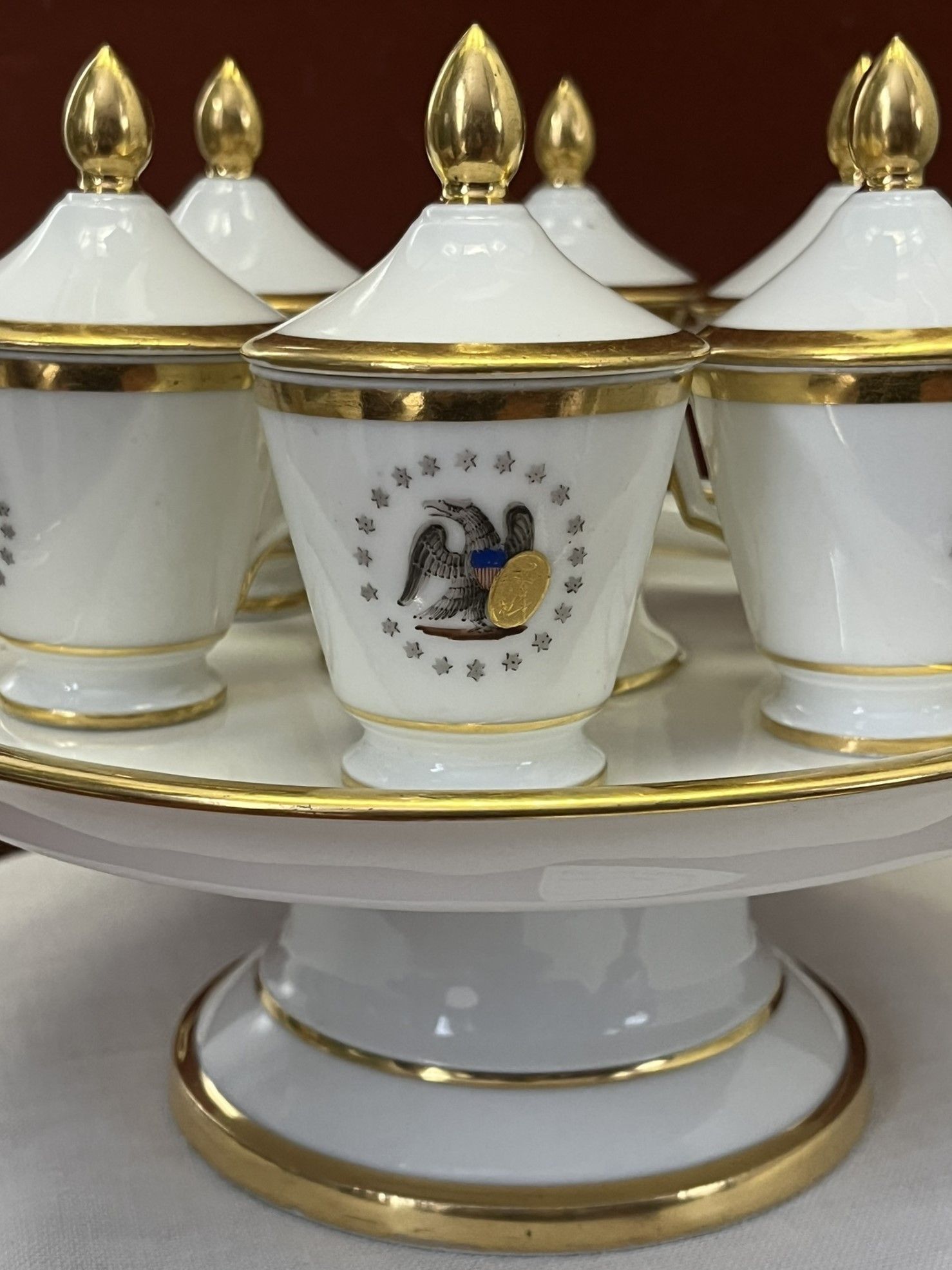 These pots de crème and stand (2001.025.006) are part of the presidential china group, 2001.025.001-.017. The pots de crème and stand were used by the Monroes during the Monroe presidency. The white porcelain pots de crème and stand are trimmed with gold. The pots de crème have single handles and have lids with gold finials. Each one has an eagle and shield surrounded by stars. The set was likely made in France around 1817.Collection