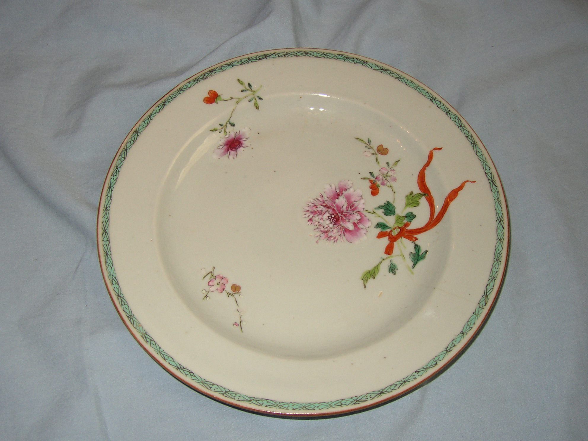 This white porcelain plate, decorated with a naturalistic floral design and a light blue-green border with cross-hatching, is one of three plates in set 2001.020.001-.003.