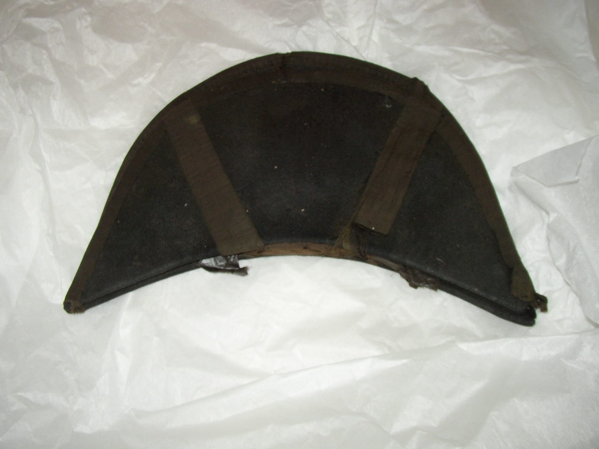 This black bicorn hat, sometimes known as a chapeau bras in the period, has a history of use with James Monroe. It appears to be made of a wool or fur felt and is trimmed with black fabric tape (or ribbons).