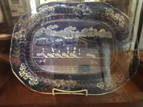 This is a generally rectangular platter that is has eight long sides. The platter is decorated with a blue and white transfer-printed design that commemorates the historic visit of Revolutionary War hero, the Marquis de Lafayette, to the United States, in 1824-1825, during Monroe's presidency. The platter reads: "Landing of General Lafayette at Castle Garden, New York in 1824" and depicts cannons firing over ships in a harbor. This platter descended in the family of James Monroe.