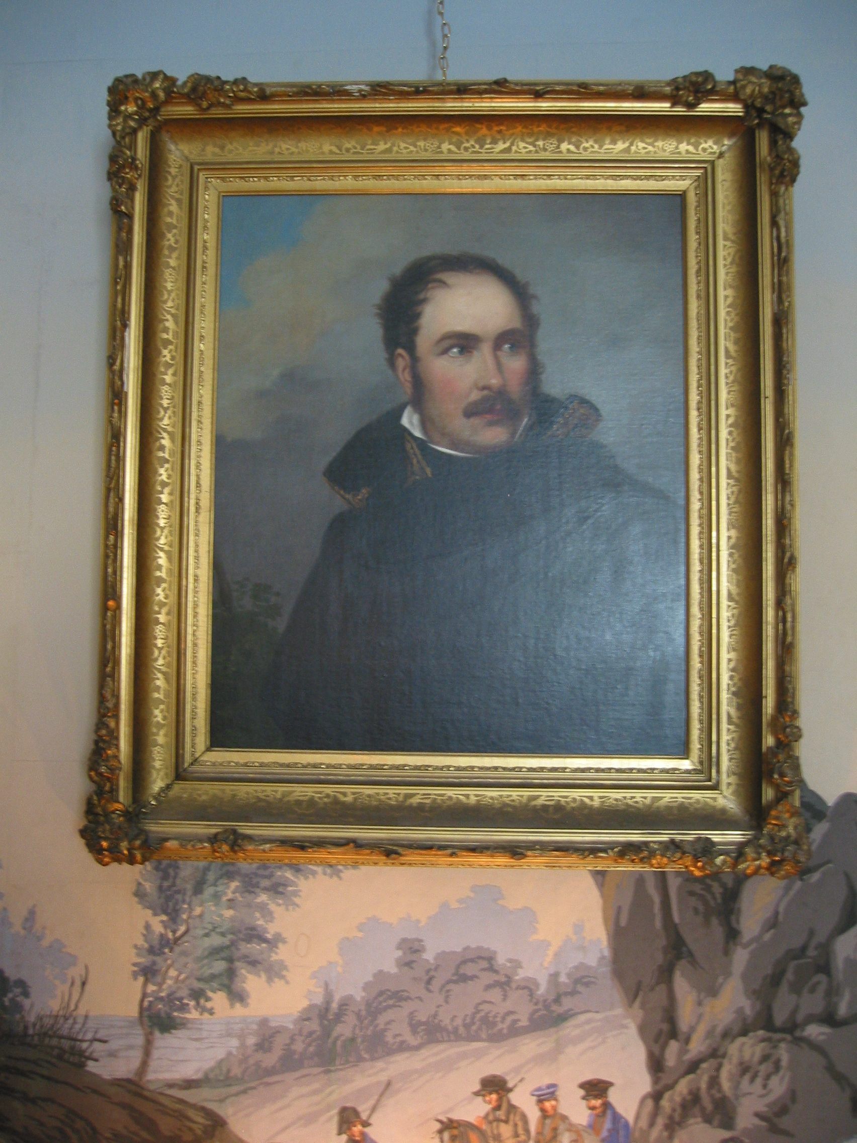 This is an oil on canvas portrait of Eugene de Beauharnais (1781-1824), Prince of Eichstatt.The sitter is wearing a military or diplomatic uniform with a black cloak. He is wearing his natural hair, swept forward; he also has sideburns and a mustache. The sitter is looking off toward his left. This portrait may have been painted by or after François Pascal Simon Gérard. This portrait was a gift to Hortensia Hay, James Monroe's granddaughter.Collection