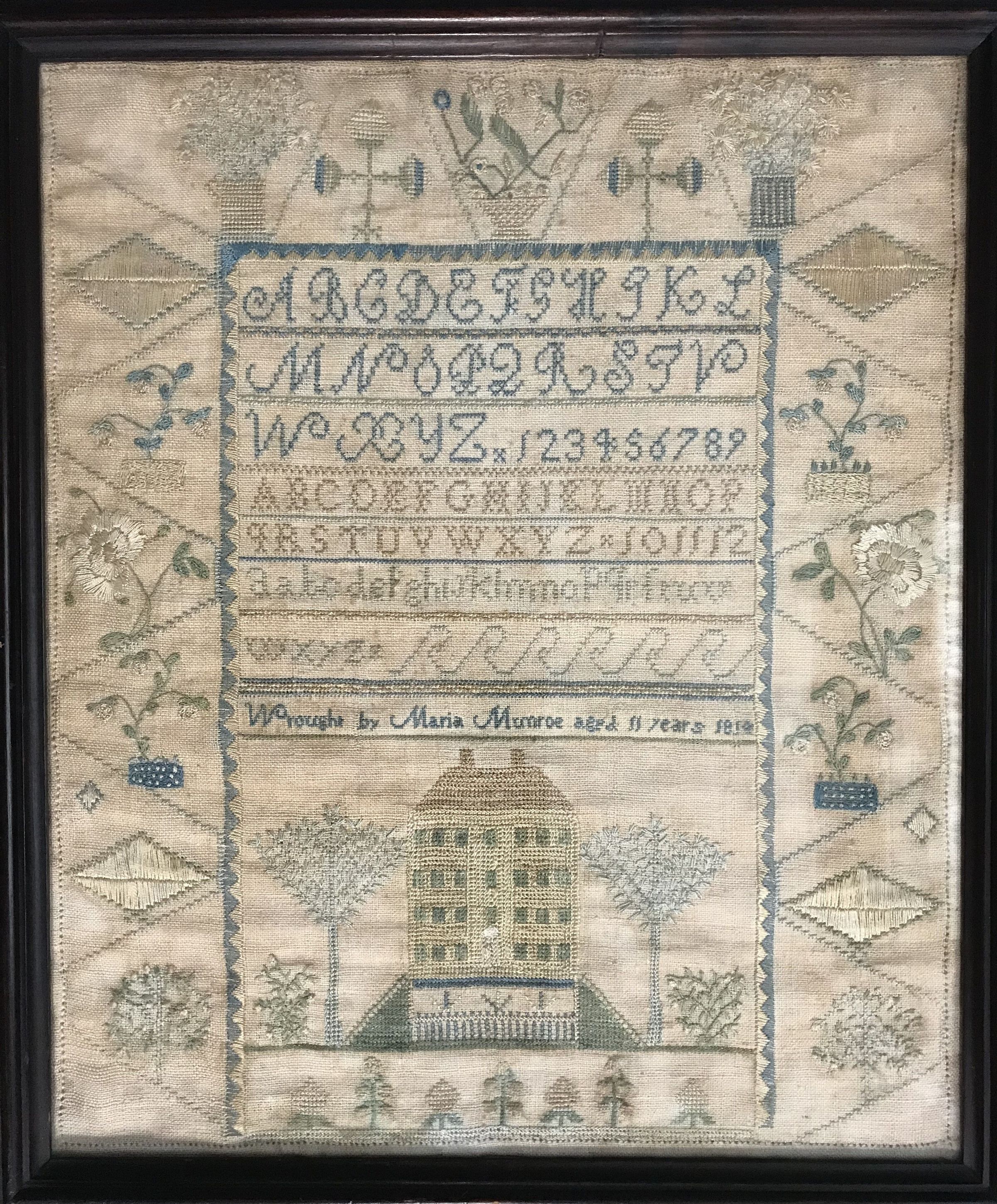 This silk on linen sampler was made by Maria Hester Monroe (1802-1814) in 1814. The sampler features alphabets and numbers as well as the text, "Wrought by Maria Munroe aged 11 years 1814." The sampler is bordered by a variety flowers and geometric designs.
