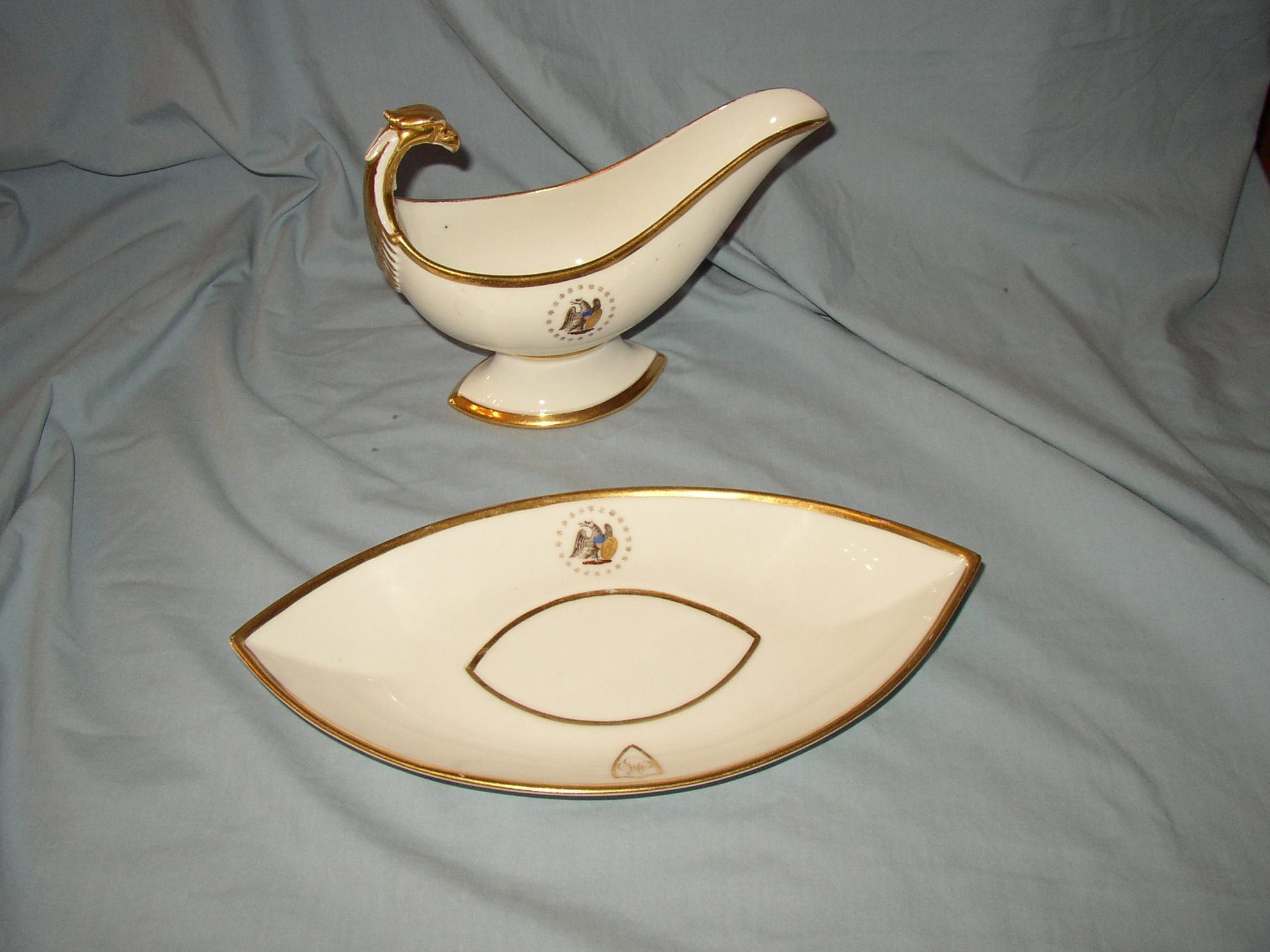 This sauceboat and sauceboat plate are among the presidential china group, 2001.025.001-.017. The white porcelain sauceboat and plate were used by the Monroes during the Monroe presidency. The sauceboat and plate are trimmed with gold and include a cursive gold "M" in a shield at top. Each is decorated with an eagle and shield surrounded by stars. The handle on the sauceboat terminates in a gilt eagle head. The set was likely made in France around 1817.Collection