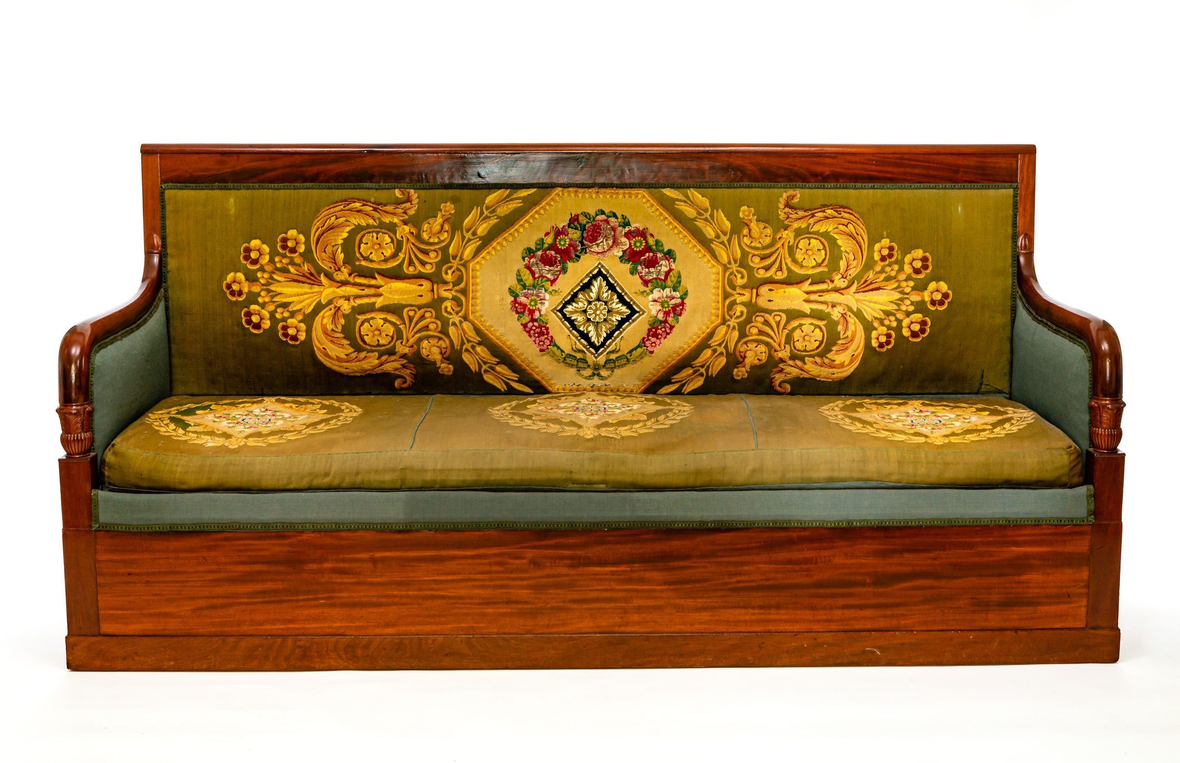 This wooden sofa was made in France and was purchased by James Monroe. The sofa is upholstered with green or blue upholstery featuring red and white naturalistic flowers in a wreath on the sofa back. The wreath is surrounded by two gold stylized plumes of flowers. The sofa seat is decorated with three similar floral and gold design.