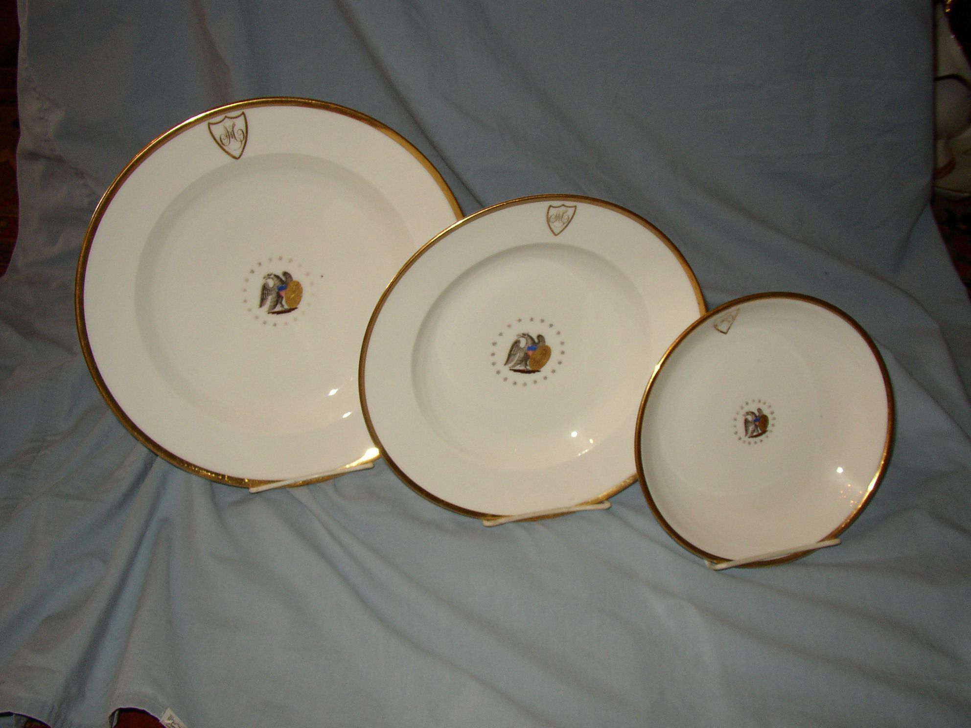 These plates are among the presidential china group, 2001.025.001-.017. The white porcelain plates were used by the Monroes during the Monroe presidency. The plates are trimmed with gold and include a cursive gold "M" in a shield at top. The center of the bowl is decorated with an eagle and shield surrounded by stars. The set was likely made in France around 1817.Collection