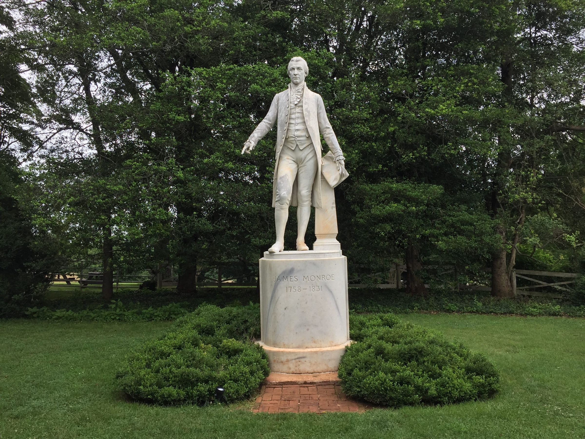 This marble statue of James Monroe was commissioned by the Venezuelan government in the 1890s. It was made by Attilio Piccirilli (1866-1945). The statue's base reads "JAMES MONROE, 1758-1831." Monroe is depicted sanding with his right leg slightly forward. He is pointing his right hand slightly downward. In this left hand, he is holding a book or collection of papers. There is a column just behind his left hand. Monroe is wearing a coat, trousers, stockings, a waistcoat, and a neckcloth. The side of the base is labeled with the artist's name and the year 1931.