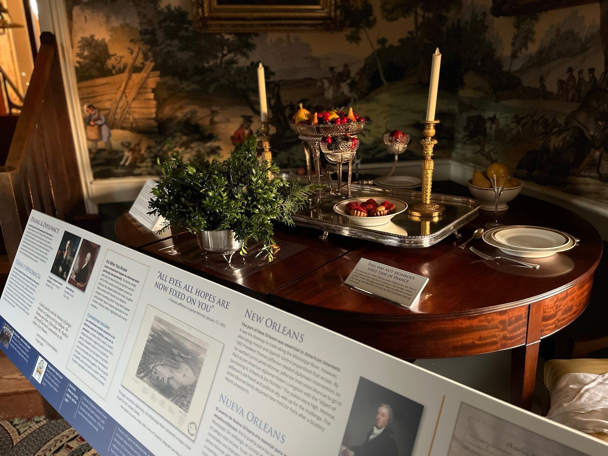 This is an extension for a dining table probably made in Philadelphia and is part of set 1974.001.009a-c. The table is supported by fourteen square, tapered legs. The edge of the top is reeded. This table has a history of ownership with James Monroe.