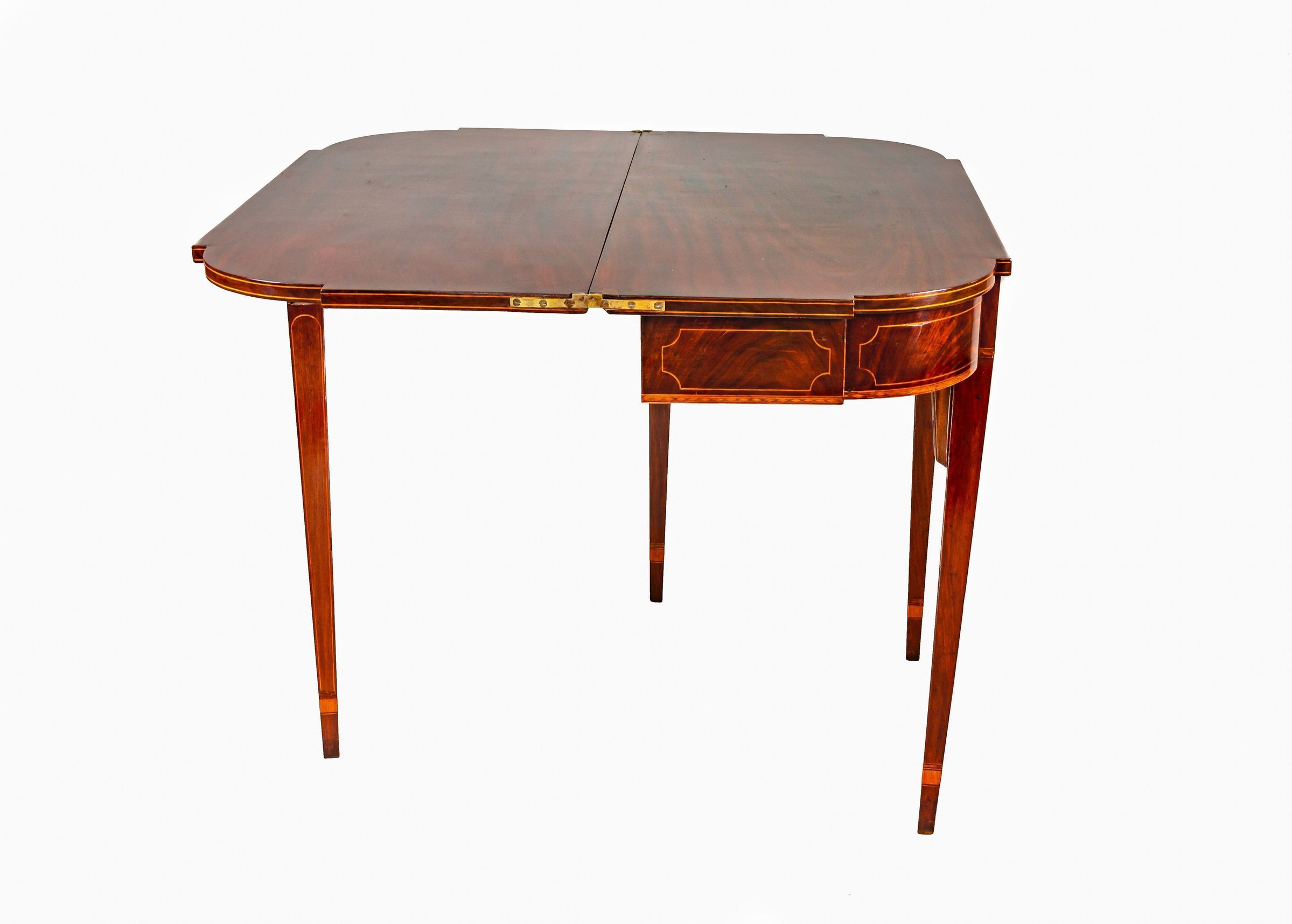 This gaming table is one of two (L2000.007.004a-b) associated with James Monroe. The table is decorated with inlay around the skirt and the legs are tapered. JM76.183 A, B Pair of Gaming TablesCollection