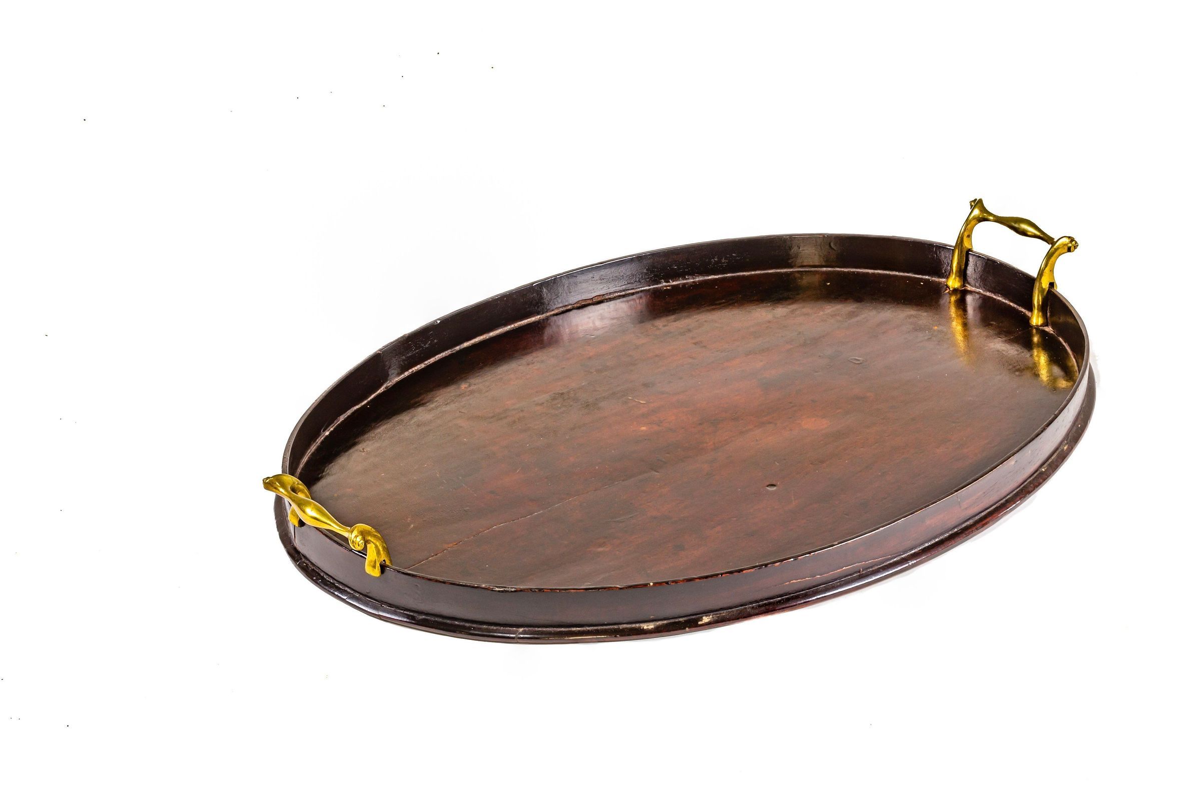 This is an oval waiter or serving tray made of mahogany. It has two brass handles on either end. It was made around 1820. JM.01.001 Waiter