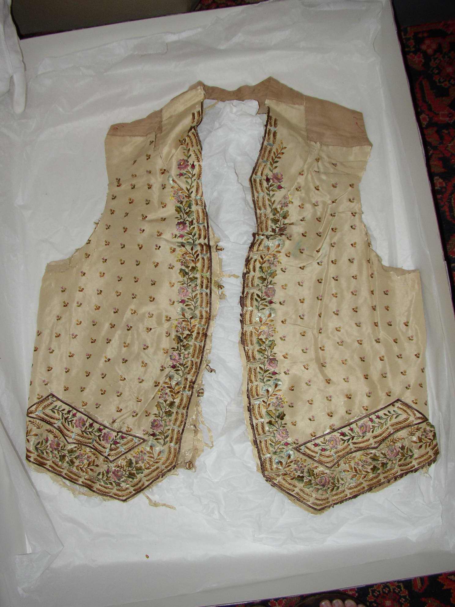 This is a silk waistcoat decorated with multi-colored silk embroidered flowers and gold accents. It was likely made in England or France. It has a history of ownership with James Monroe.