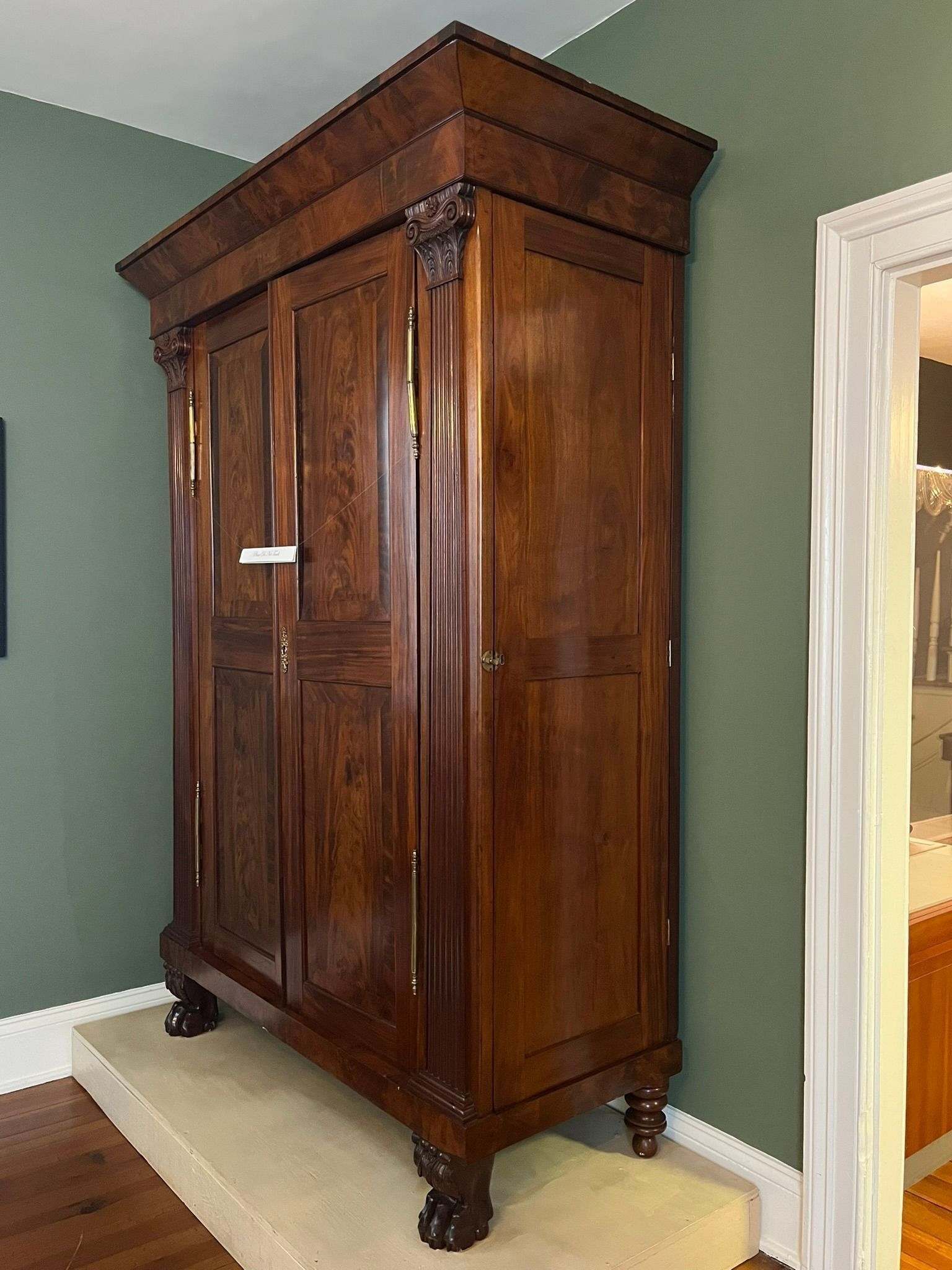 This mahogany wardrobe was made in New York. It features two paneled doors flanked by columns on either side. The feet are stylized animal feet. The wardrobe descended in the Gouverneur family to Laurence Gouverneur Hoes (1900-1978). JM76.586 WardrobeCollection