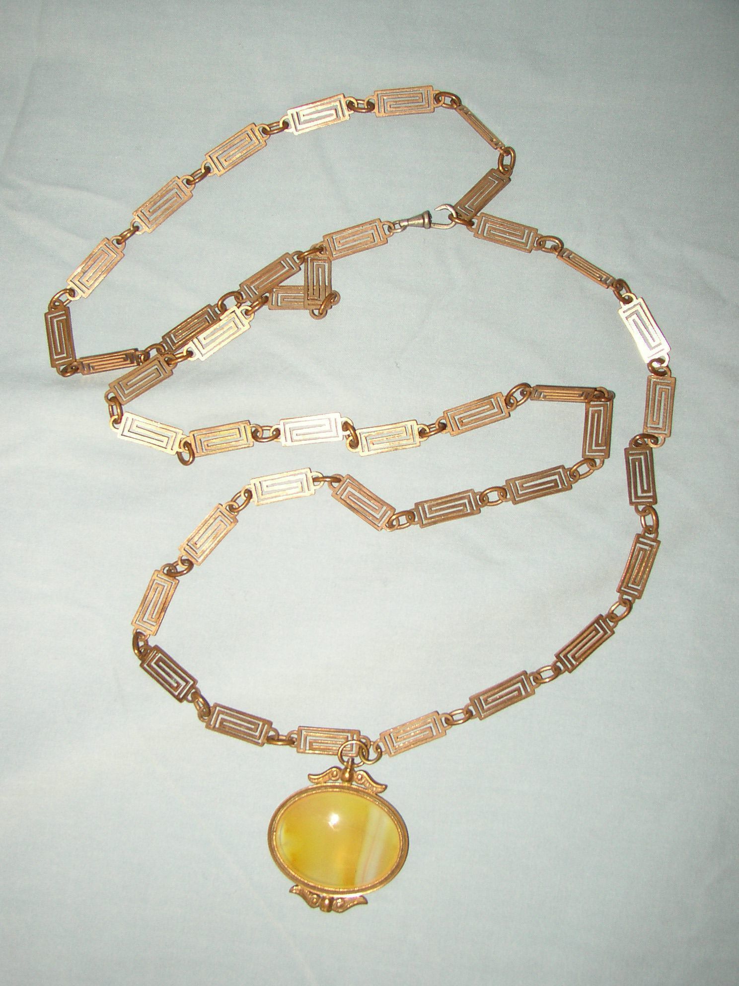 This watch chain is made of pinchbeck (a copper-zinc alloy) and includes a yellow agate fob. The chain features a series of geometric rectangles linked by circular attachments. This watch chain has a history of use with James Monroe.