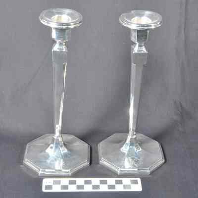 Early 20th century: two sterling silver candlesticks. Marked with fancy calligraphic "H" in a circle. Characters around circle may be "T H 4 H L X 7". On bottom "D" in oval over "STERLING 94" and "WEIGHTED". These candlesticks were awarded to Miss Louise Briscoe for academic achievement at Stuart Hall before World War I.Acquisition