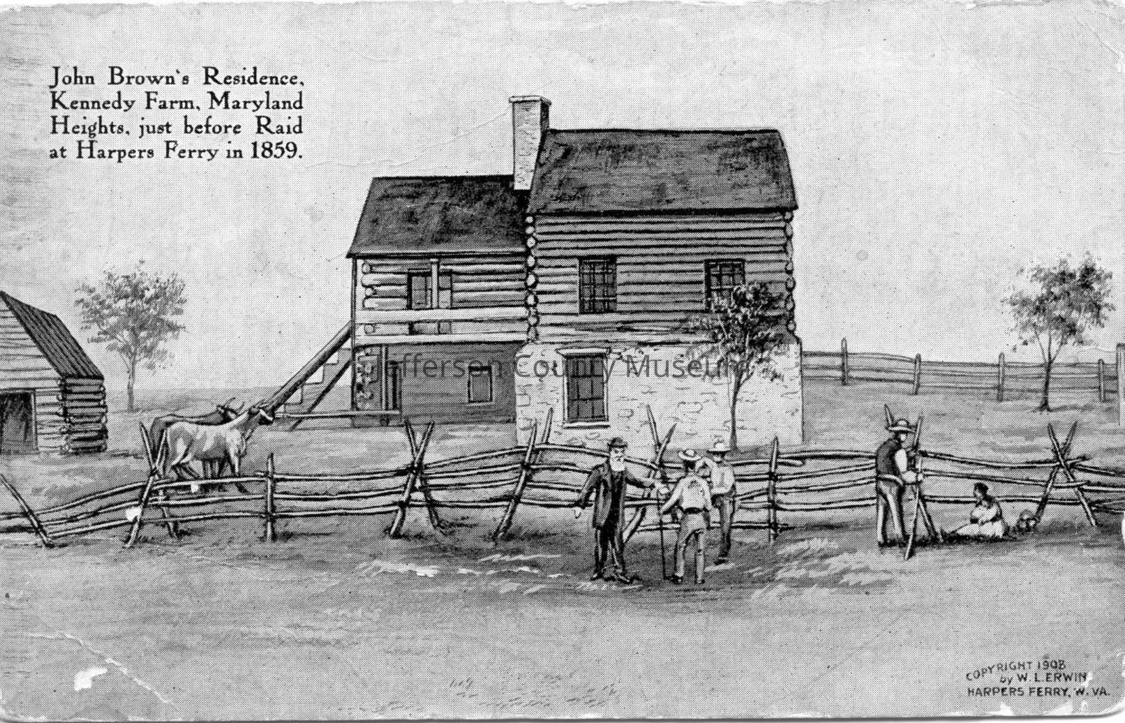 On front: "John Brown's Residence, Kenney Farm, Maryland Heights, just before Raid at Harpers Ferry in 1859, Copyright 1908 by W. L. Erwin, Harpers Ferry, W. VA."