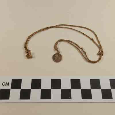 Pendant made from gold nugget, a souvenir of the gold rush of 1849. Has "H" on one side and "1849 on the other. Hangs on gold chain.Acquisition