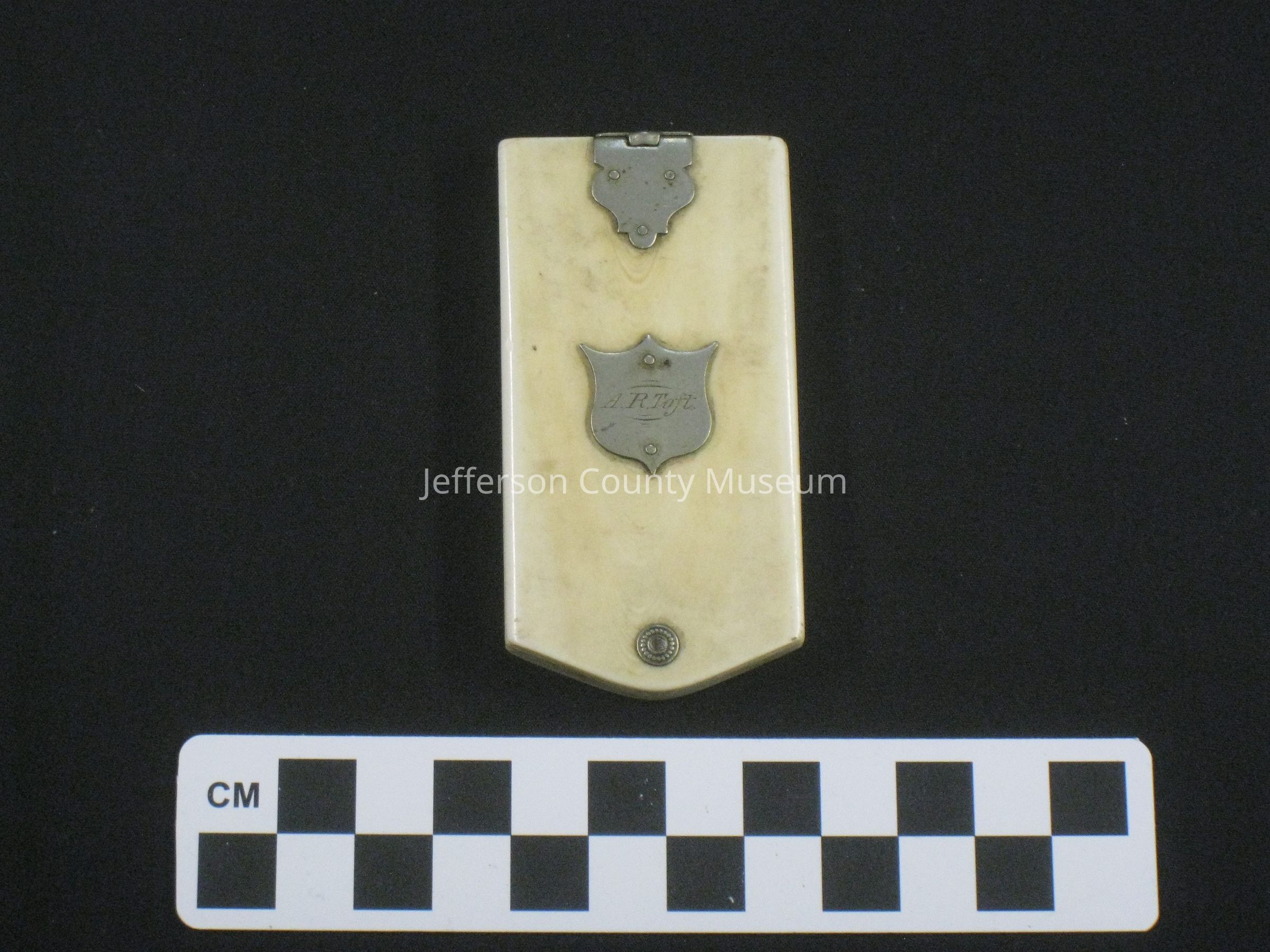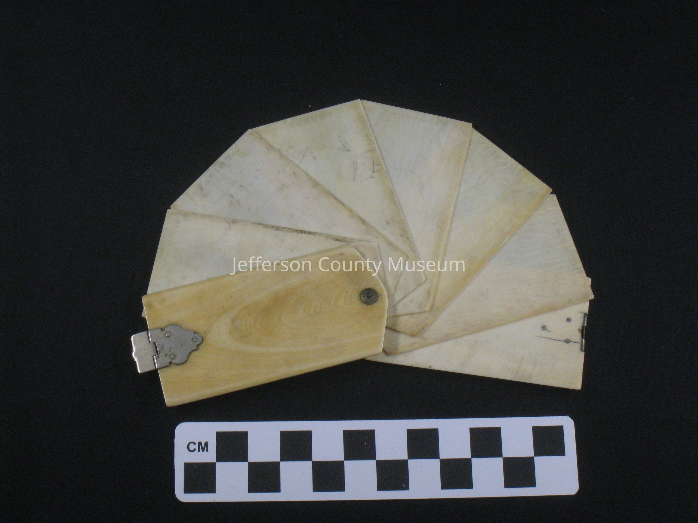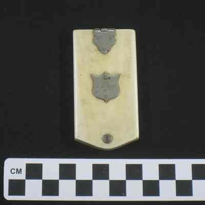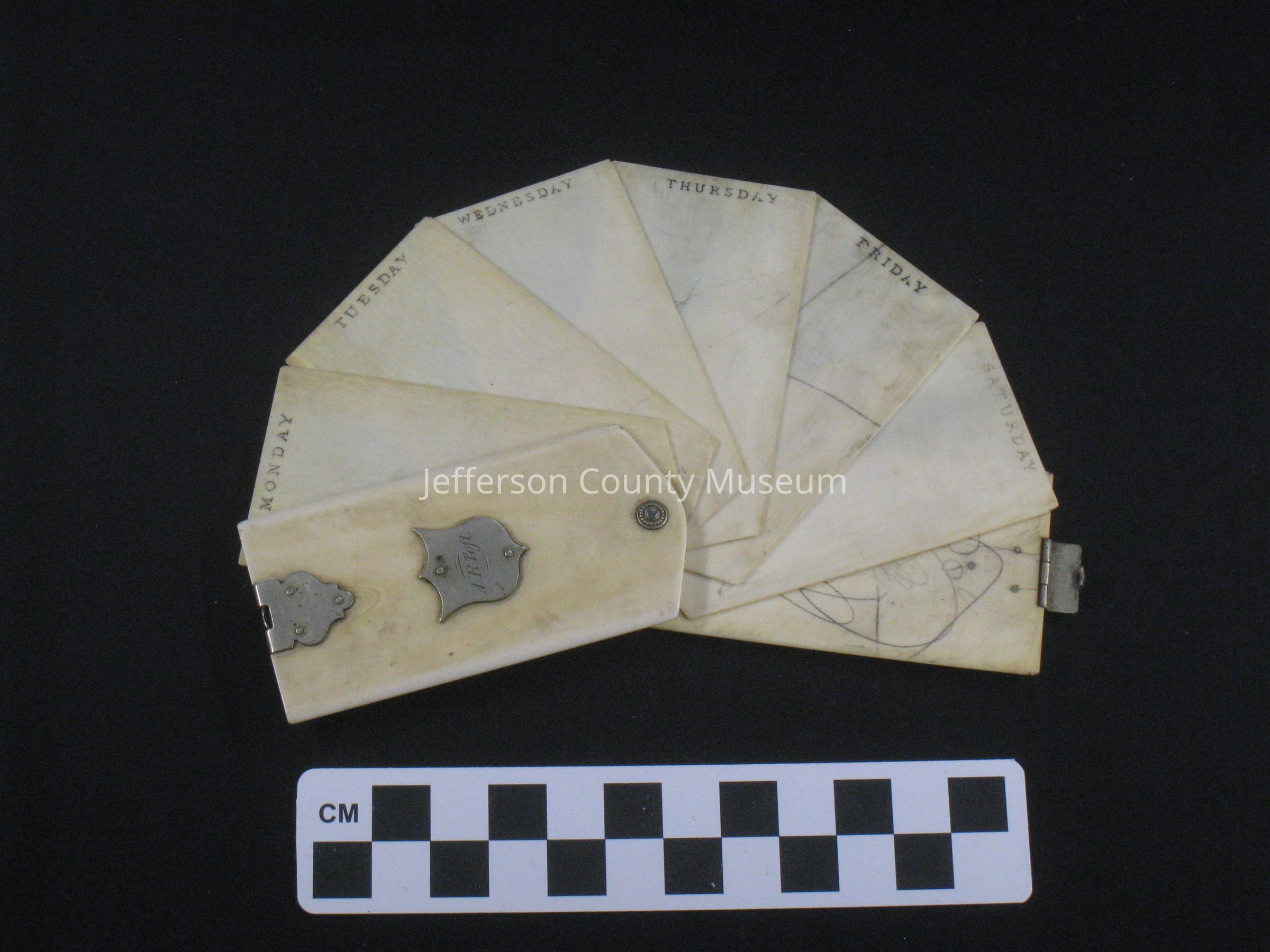Ivory covered note pad with 6 possibly celluloid off-white leaves for writing notes in pencil. Monday through Saturday printed at the top of each sheet. The cover and sheets are held together with a silver pin. The cover is closed with a silver clasp and a small shield with "A. R. Toft" is on front.Acquisition