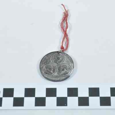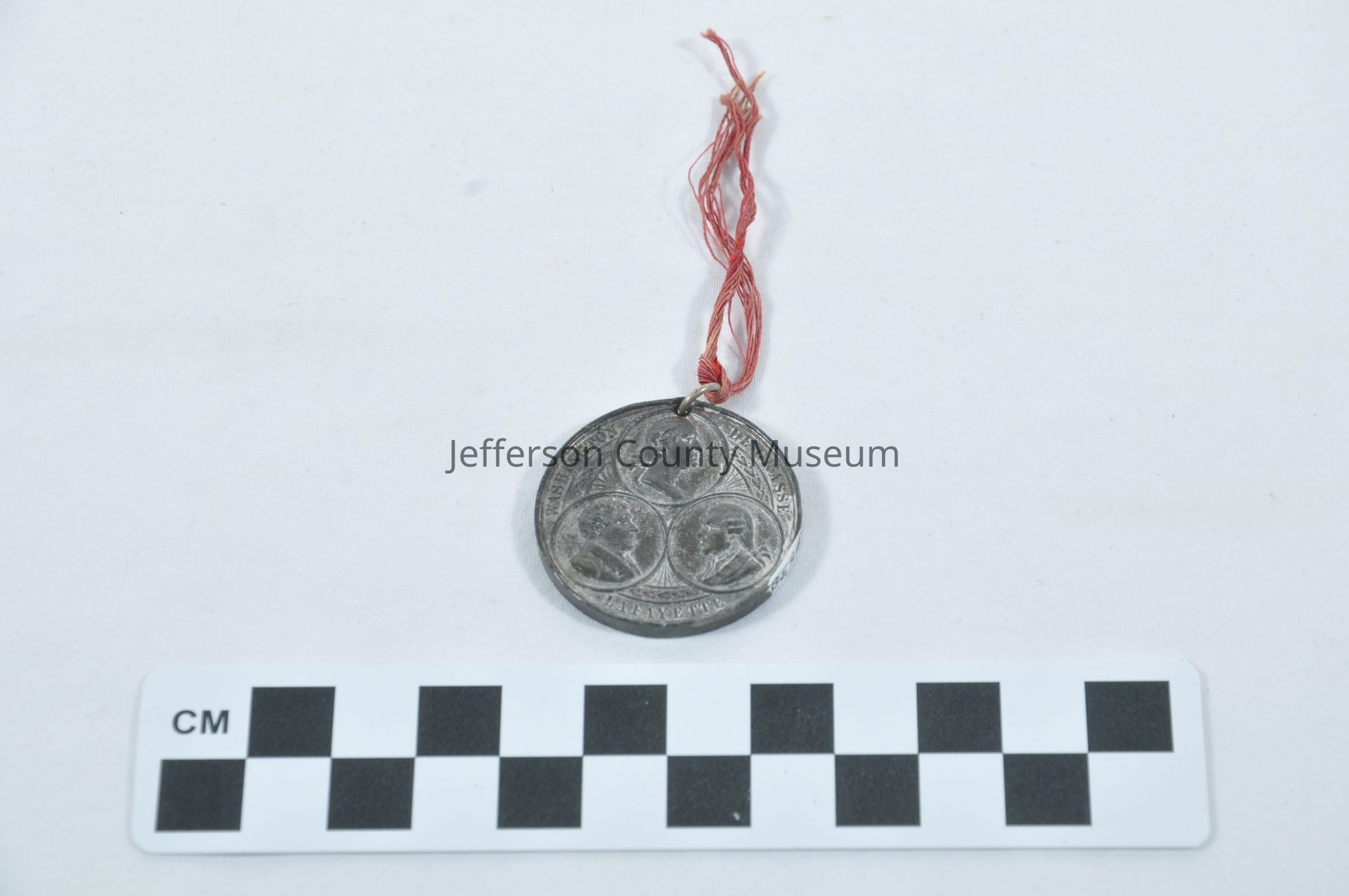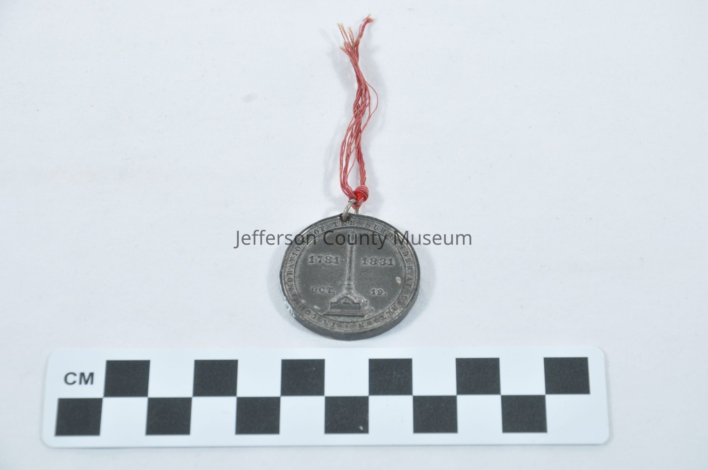 Round medal made of base metal. Shows relief profile of "WASHINGTON, LAFAYETTE, DEGRASSE". Reverse shows the Yorktown monument and the dates 1781 and 1881. Around outside edge of reverse "IN COMMEMORATION OF THE SURRENDER AT YORKTOWN OCT. 19", 1781. Has red string attached.Acquisition