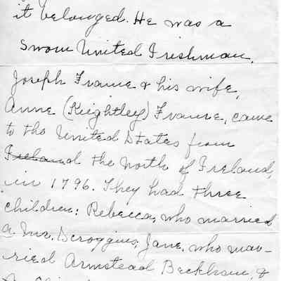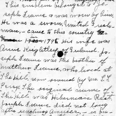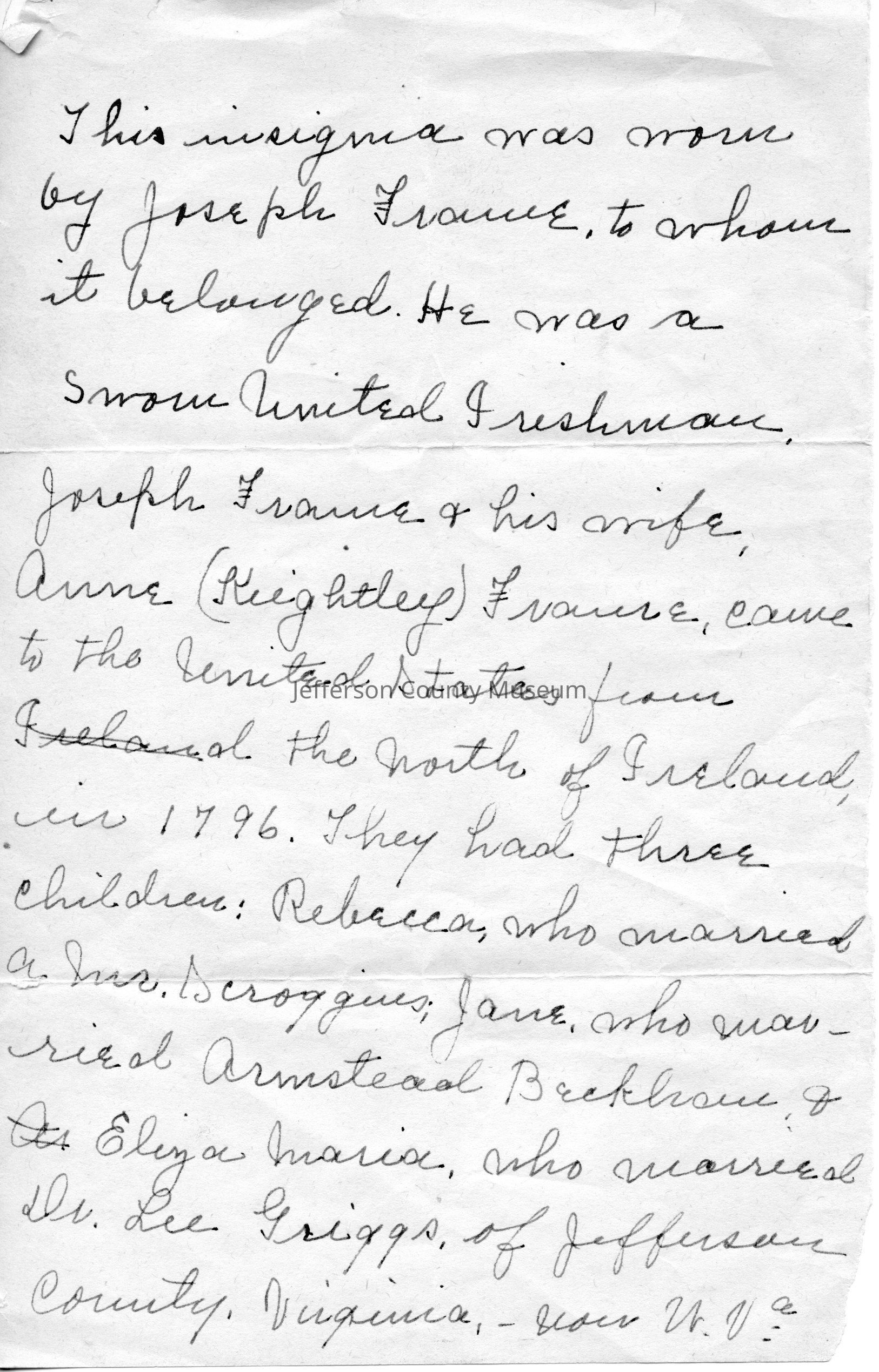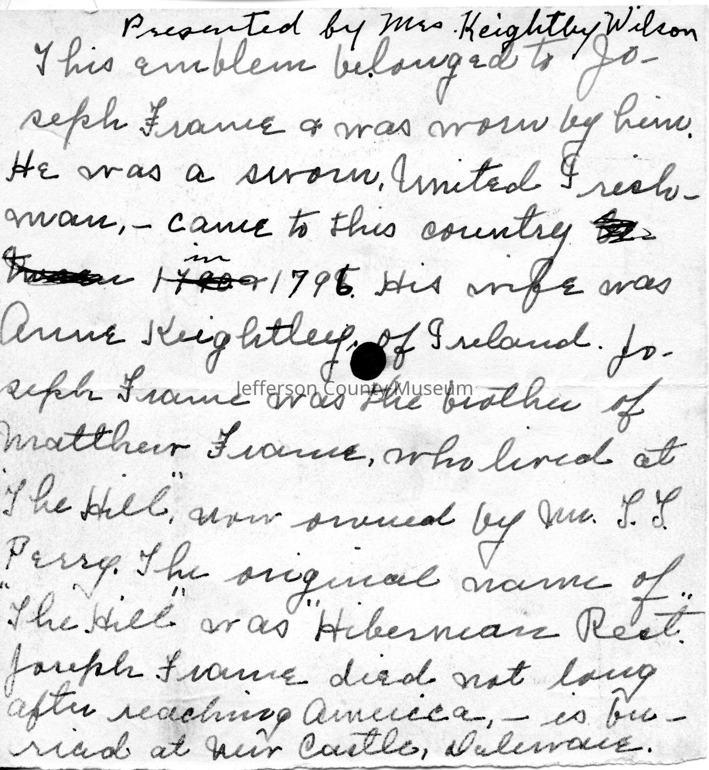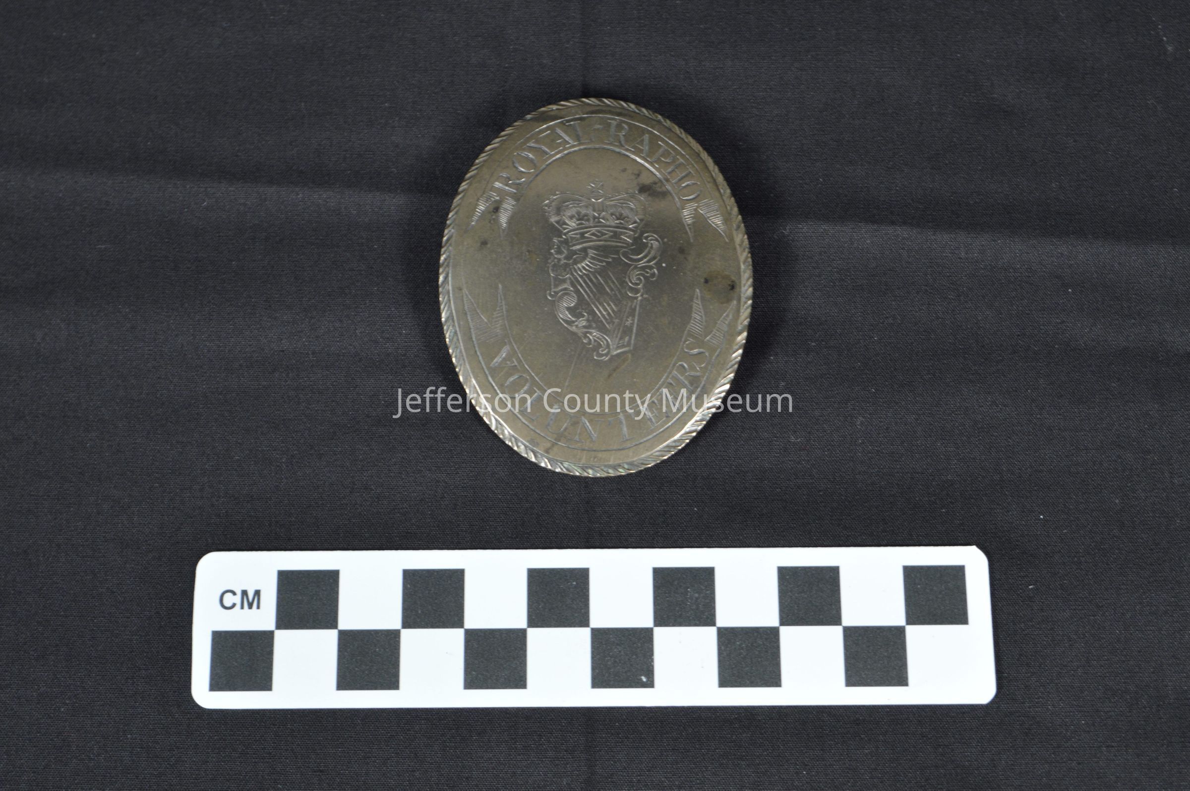 Probably a shoulder belt plate, oval, silverplate on brass. Around edge "ROYAL-RAPHO VOLUNTEERS" Harp and crown in center. This emblem belonged to Joseph Frame and was worn by him.Acquisition