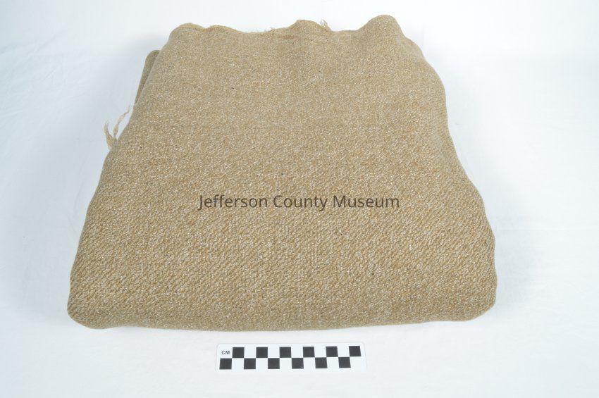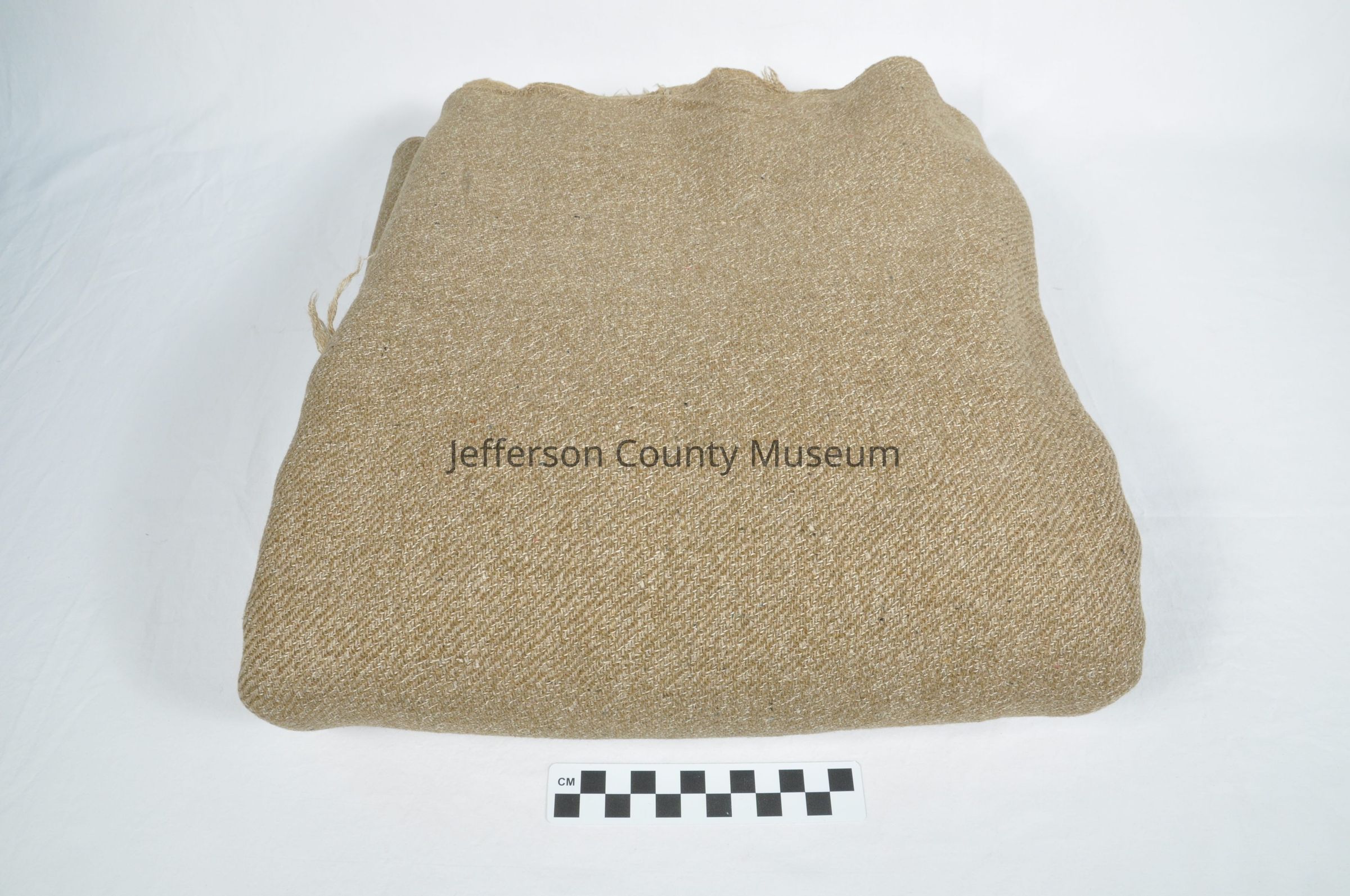 Tan or butternut shawl. Four darker brown stripes and fringe at top.