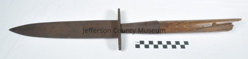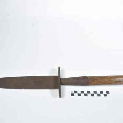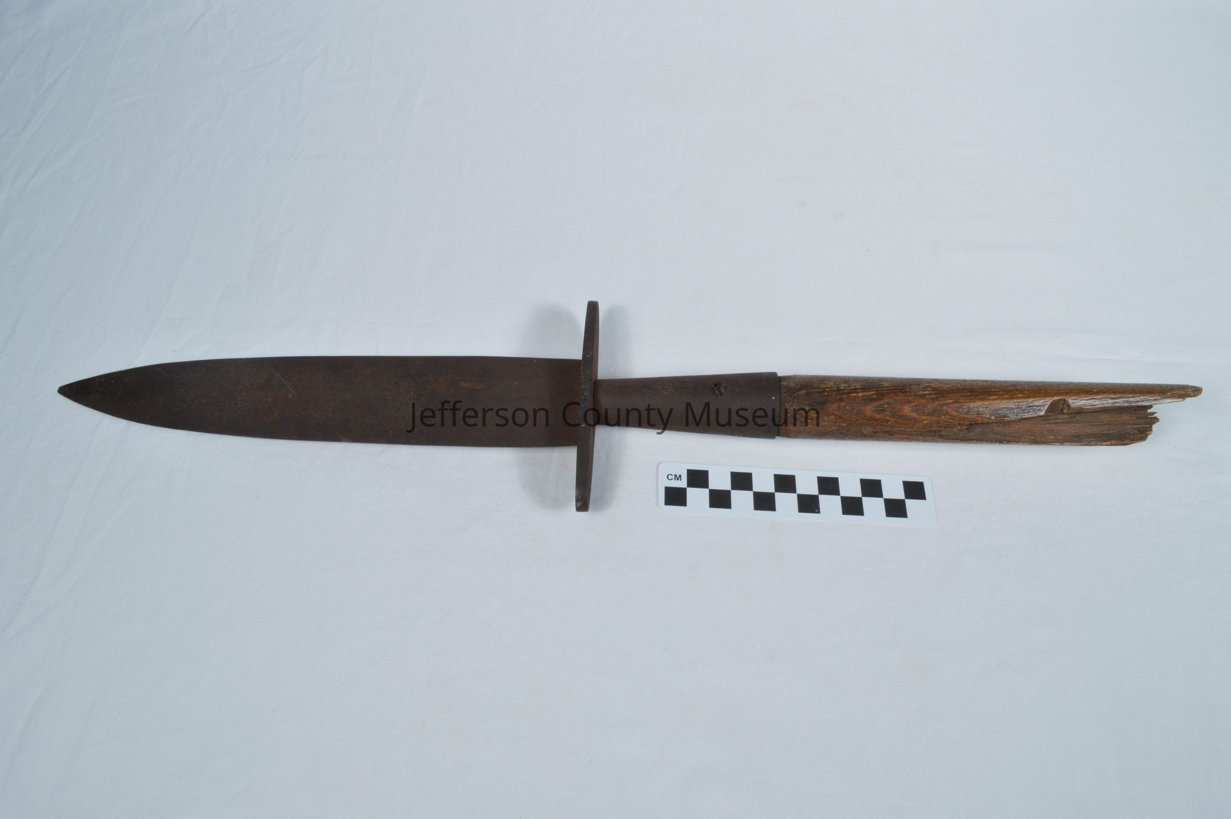 One of John Brown's pikes. Double edged blade with iron cross guard. Broken piece of ash pole attached. Stamped on guard and shank for pole "138".Acquisition