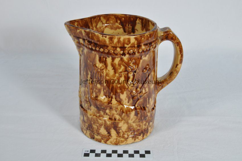 Bennington type molded pitcher. Two quart size, peacock pattern, mottled brown glaze.