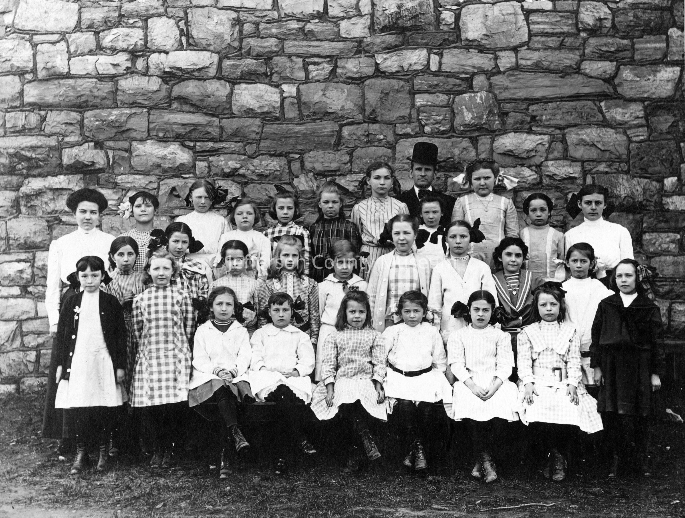 Charles Town Graded School 27 children and 3 teachers. Wright Denny is pictured in back row with hat.