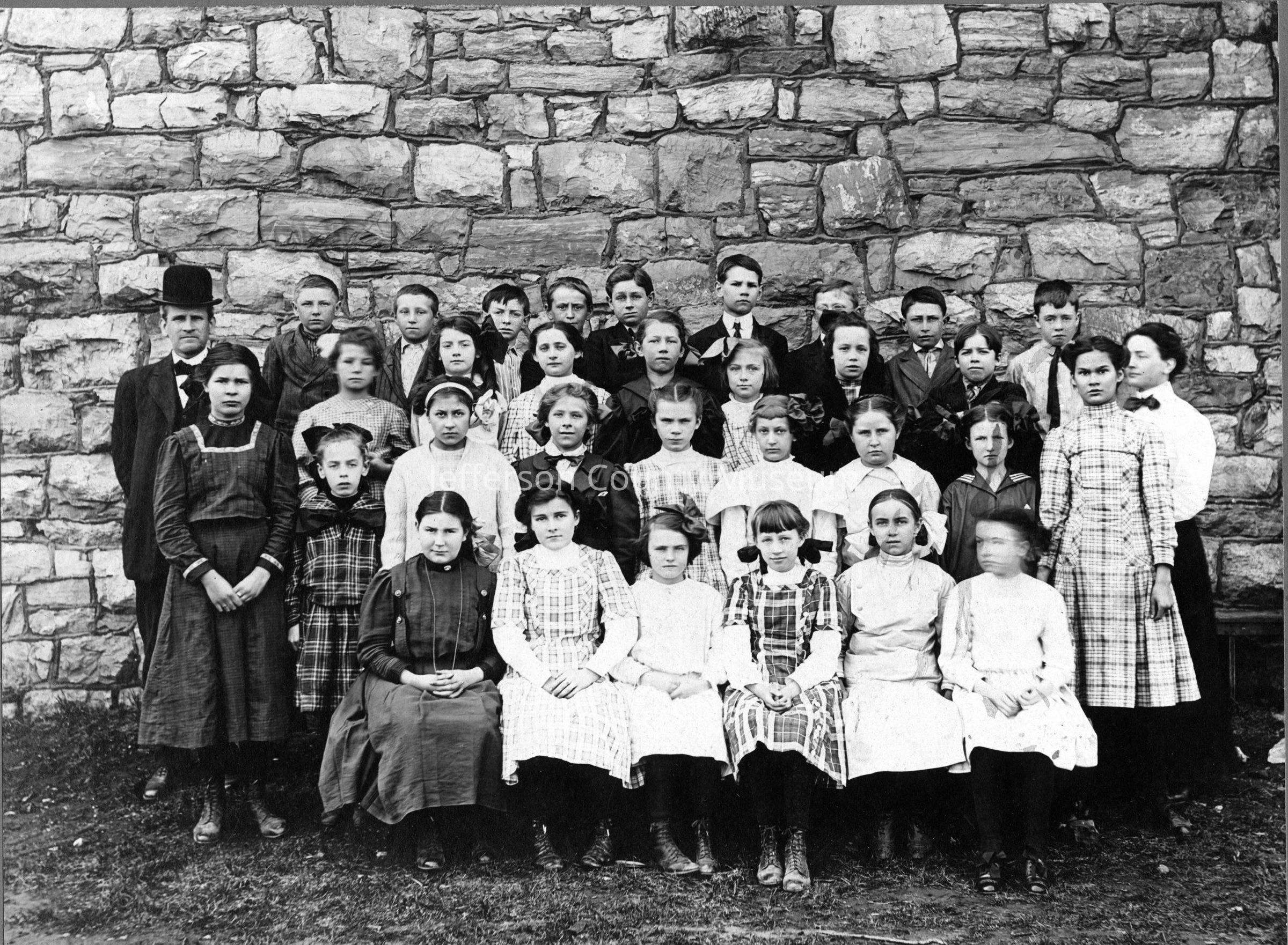 Charles Town Graded and High School class photo with about 30 children and teachers. Wright Denny is pictured far left, last row, with hat.Acquisition