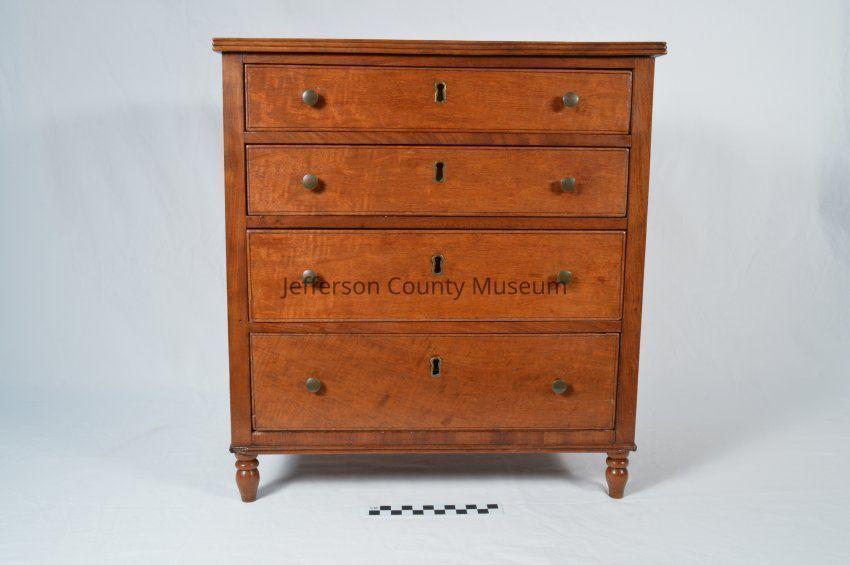 Miniature chest of drawers. Solid wood drawer fronts, sides and top with pine and poplar secondary wood. Four drawers with keyholes and small brass pulls. Carved feet.Acquisition