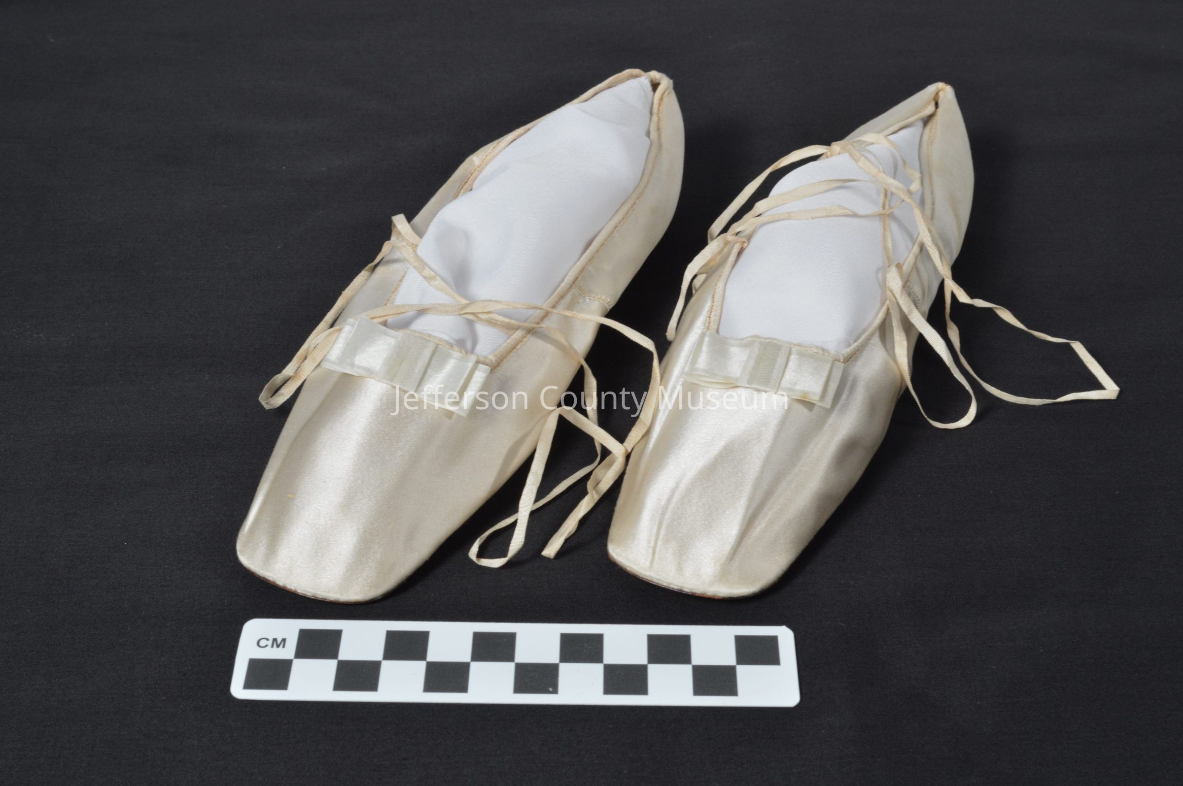 Light cream colored silk ballroom slippers with strings still attached. Lighter colored rectangular bow on each slipper. Thin leather soles. Slippers appear to be made for either foot. Circa 1890-1900. 618a is right shoe. 618b is left shoe.Acquisition